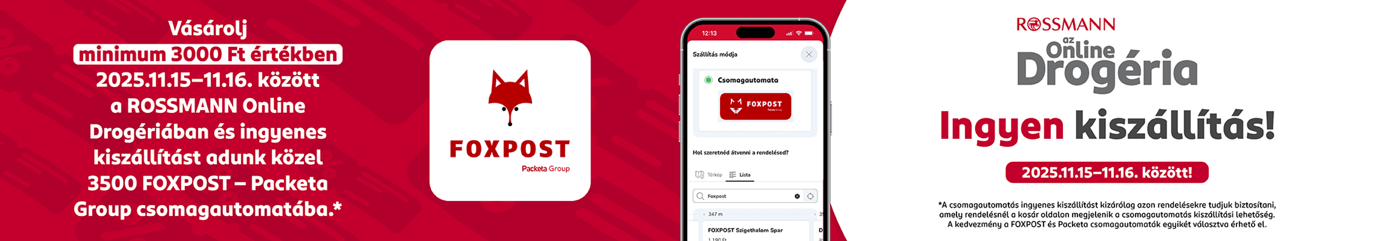 Vásárolj minimum 3000 Ft értékben 2025.11.15-16. között a ROSSMANN Online Drogériában és ingyenes kiszállítást adunk közel 3500 FOXPOST - Packeta Group csomagautomatába.