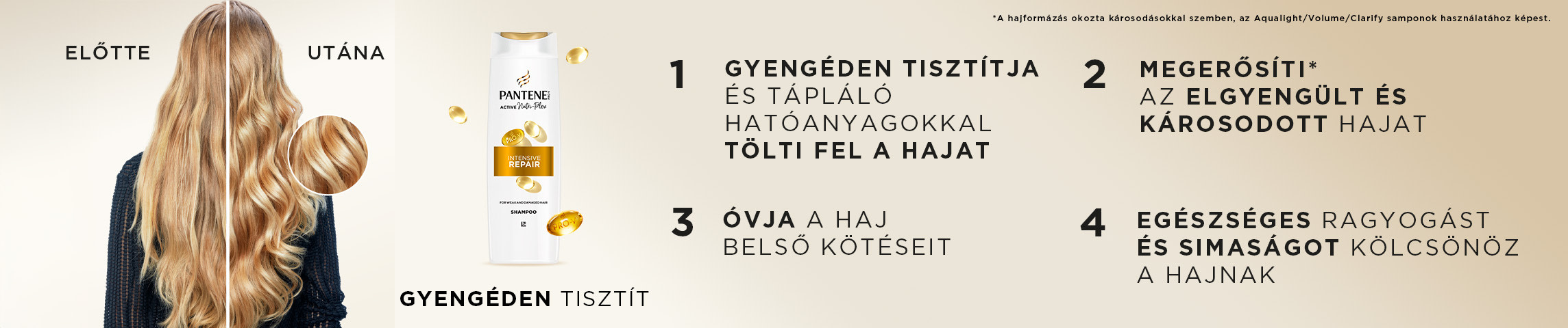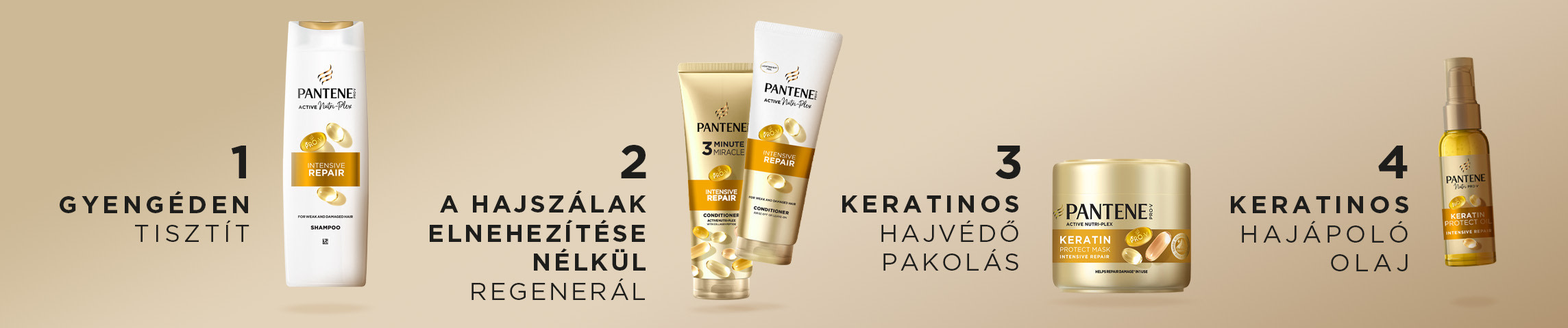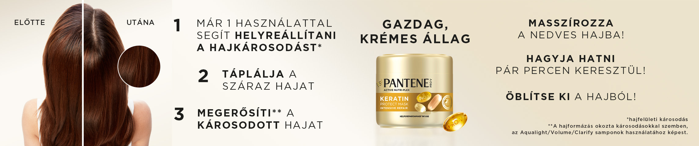 A Swiss Vitamin Institute által tesztelt, mikrotápanyagokkal dúsított Pantene Pro-V Intensive Repair Keratin Reconstruct intenzív, regeneráló hajpakolás már az első használat alkalmával segít helyreállítani a haj 6 hónap alatt szerzett károsodásait. A Pantene Pro-V gazdag formulája a hajrostokba hatolva segít megerősíteni és táplálni az összes hajszálat, a hajtőtől egészen a hajvégekig. (A hajformázás okozta károsodások helyreállítása/védelem a hajformázás okozta káros hatásokkal szemben.)