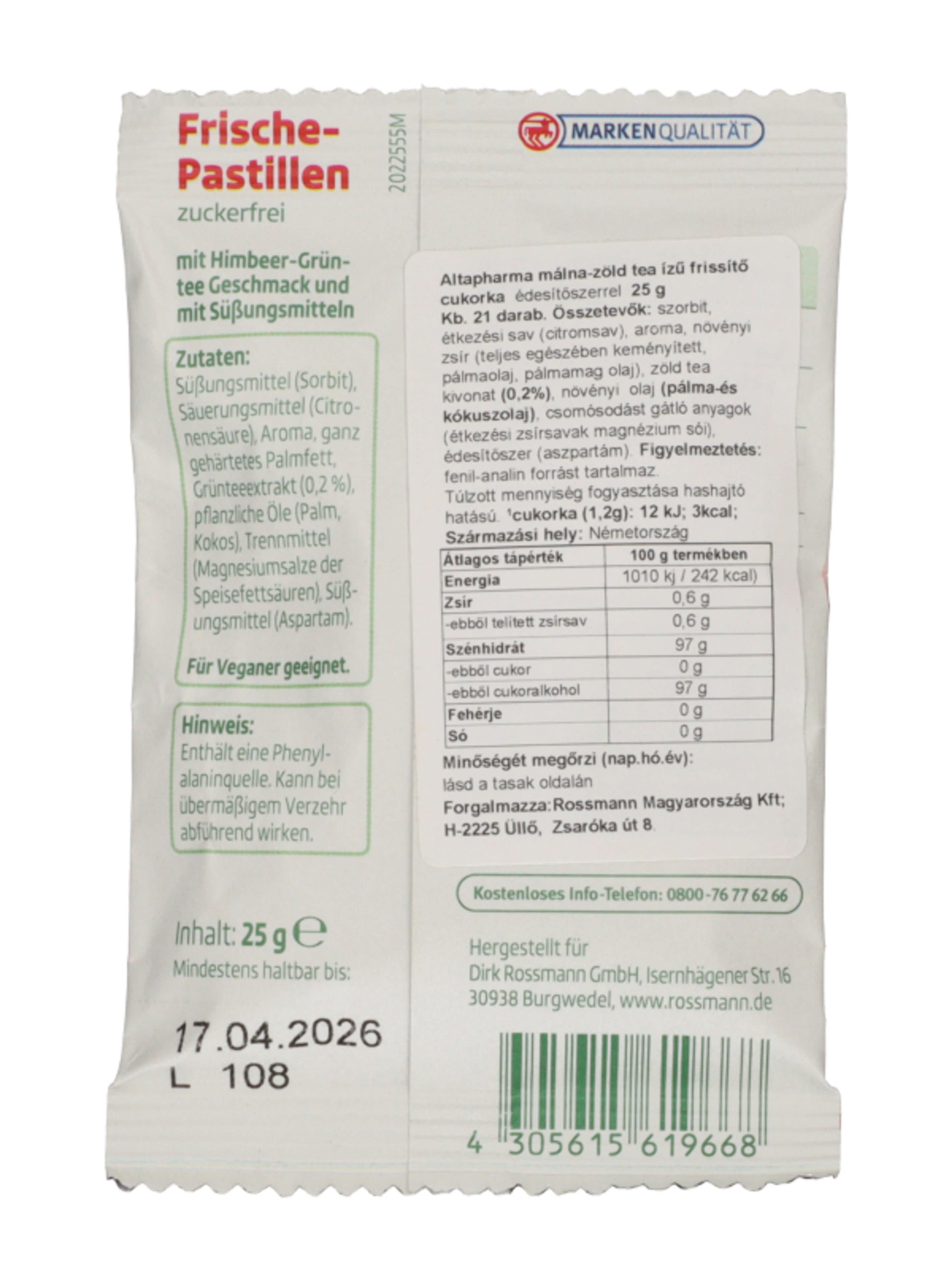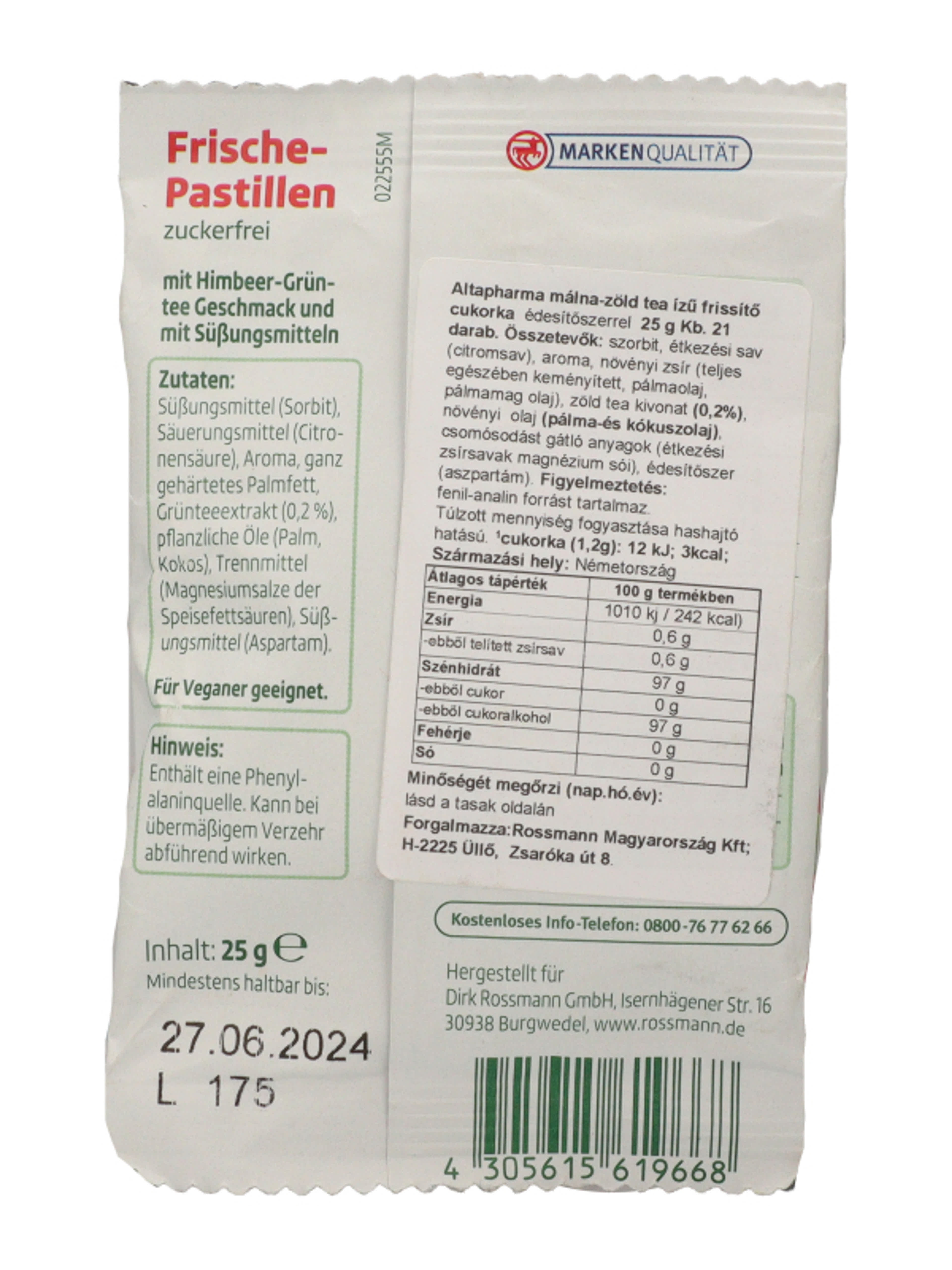 Altapharma málna-zöldtea ízű cukorka - 25 g