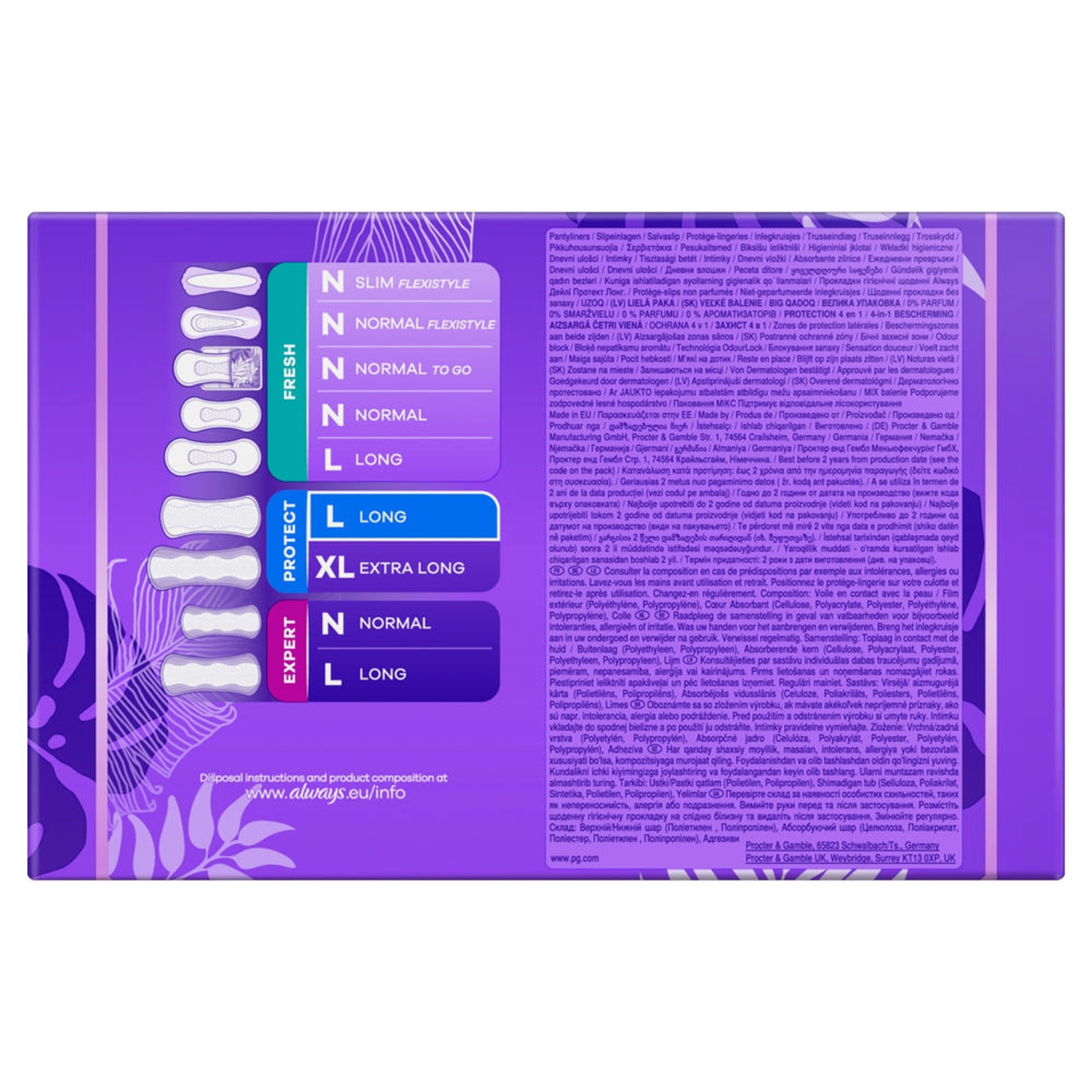 Gondoskodjon az egész napos védelemről az Always Daily Protect Hosszú tisztasági betéttelEzek az illatanyag- és színezékmentes tisztasági betétek megnövelt hosszúsággal és szélességgel rendelkeznek a nagyobb lefedettség érdekében! A nedvszívó zóna és az oldalsó védőréteg mindennapi védelmet nyújt a hüvelyfolyás, rendszertelen vérzés és enyhe menstruáció esetén. Élvezze a tiszta és friss érzetet!
