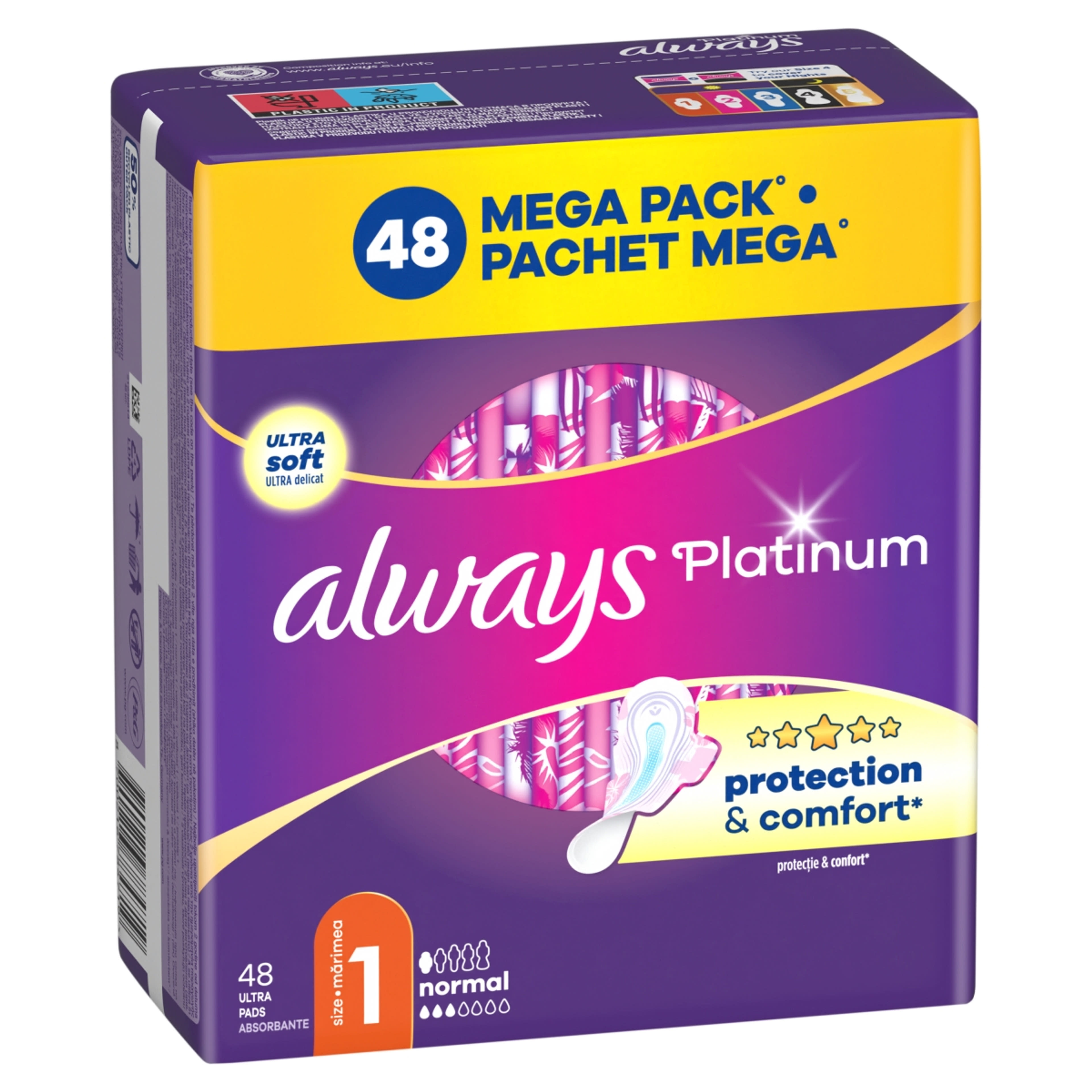 Extra puha fedőréteggel rendelkező betétek a kivételes kényelem és a szivárgás elleni védelem érdekében. A ComfortLock szárnyak bármilyen típusú fehérneműhöz kiválóan illeszkednek. Az 1-es méretű Always Platinum Normal szárnyas betétet nappali használatra ajánljuk enyhe vérzés esetén. Próbáld ki a 4-es méretű Always Platinum Secure Night betétet, amely a legkiválóbb éjszakai védelmet nyújtó Always Platinum betét! Puha és rugalmas kialakítás, mely követi a test vonalait. Az extra puha, védelmet nyújtó fedőréteggel rendelkező Always Platinum betétek kialakításuknak köszönhetően segítenek megakadályozni a szivárgást, nem mozdulnak el és optimális kényelmet nyújtanak. Az Always Platinum betétek viselésekor akár meg is feledkezhetsz a menstruációról.Az 1-es méretű Always Platinum Normal szárnyas betétet nappali használatra ajánljuk enyhe menzesz esetén. Próbáld ki a 4-es méretű Always Platinum Secure Night betétet, amely a legkiválóbb éjszakai védelmet nyújtó Always Platinum betét!
