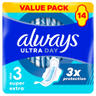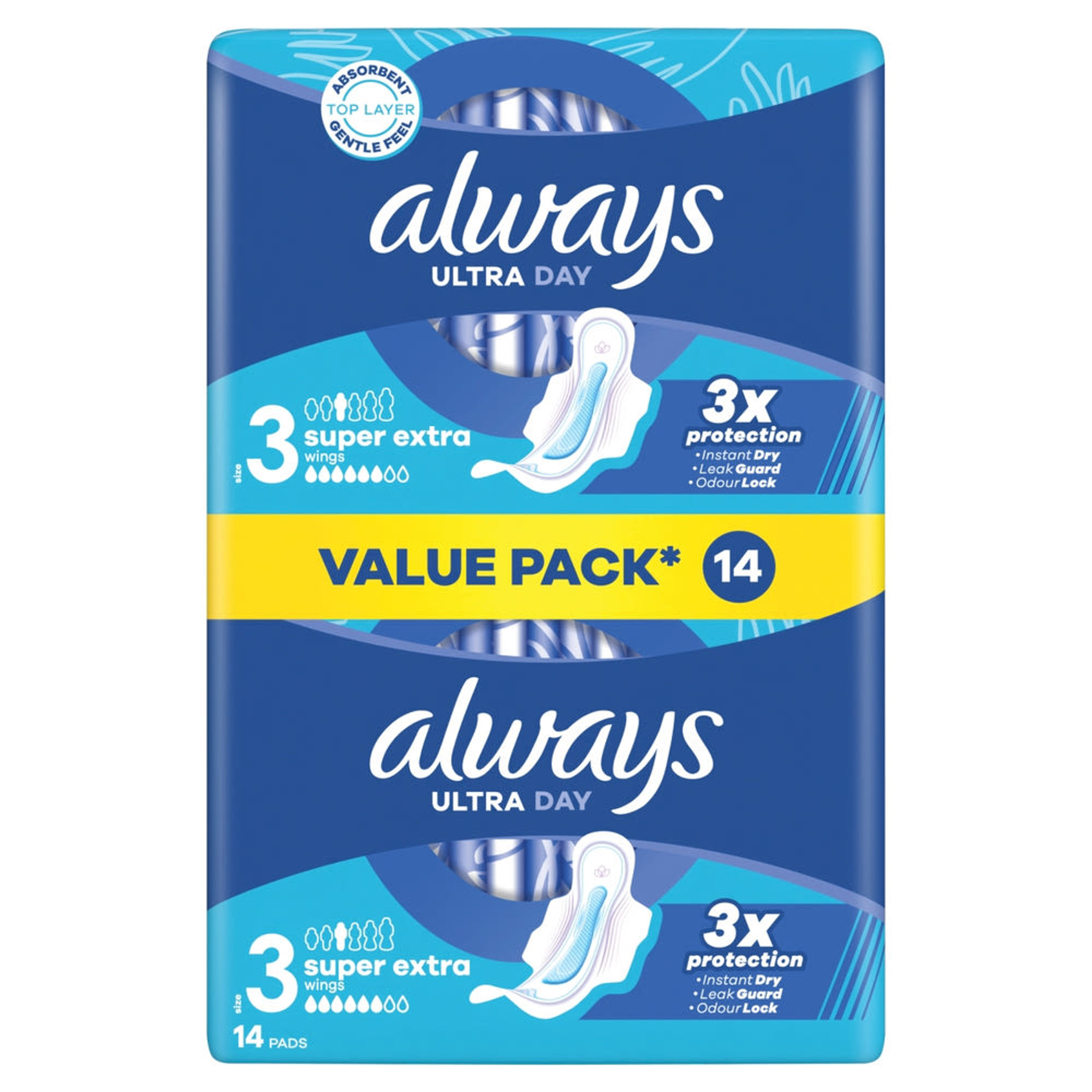 „Ne érd be kevesebbel, válaszd a 3x-os védelmet nyújtó, 3-as méretű ALWAYS Ultra Super Extra egészségügyi betétet! A nedvszívó és gyengéd fedőréteggel rendelkező Always betét InstantDry technológiájának köszönhetően másodpercek alatt felszívja a nedvességet, a LeakGuard és OdorLock technológia pedig segít megelőzni a szivárgást és a kellemetlen szagokat. Az egyedülálló ComfortLock szárnyakat úgy tervezték, hogy bármilyen típusú fehérneműhöz remekül illeszkedjenek. A fokozott éjszakai védelem érdekében próbáld ki a különböző méretekben kapható Always Night betétet! Az Always Ultra egészségügyi betétek a Skin Health Alliance bőrgyógyászati jóváhagyásával rendelkeznek.