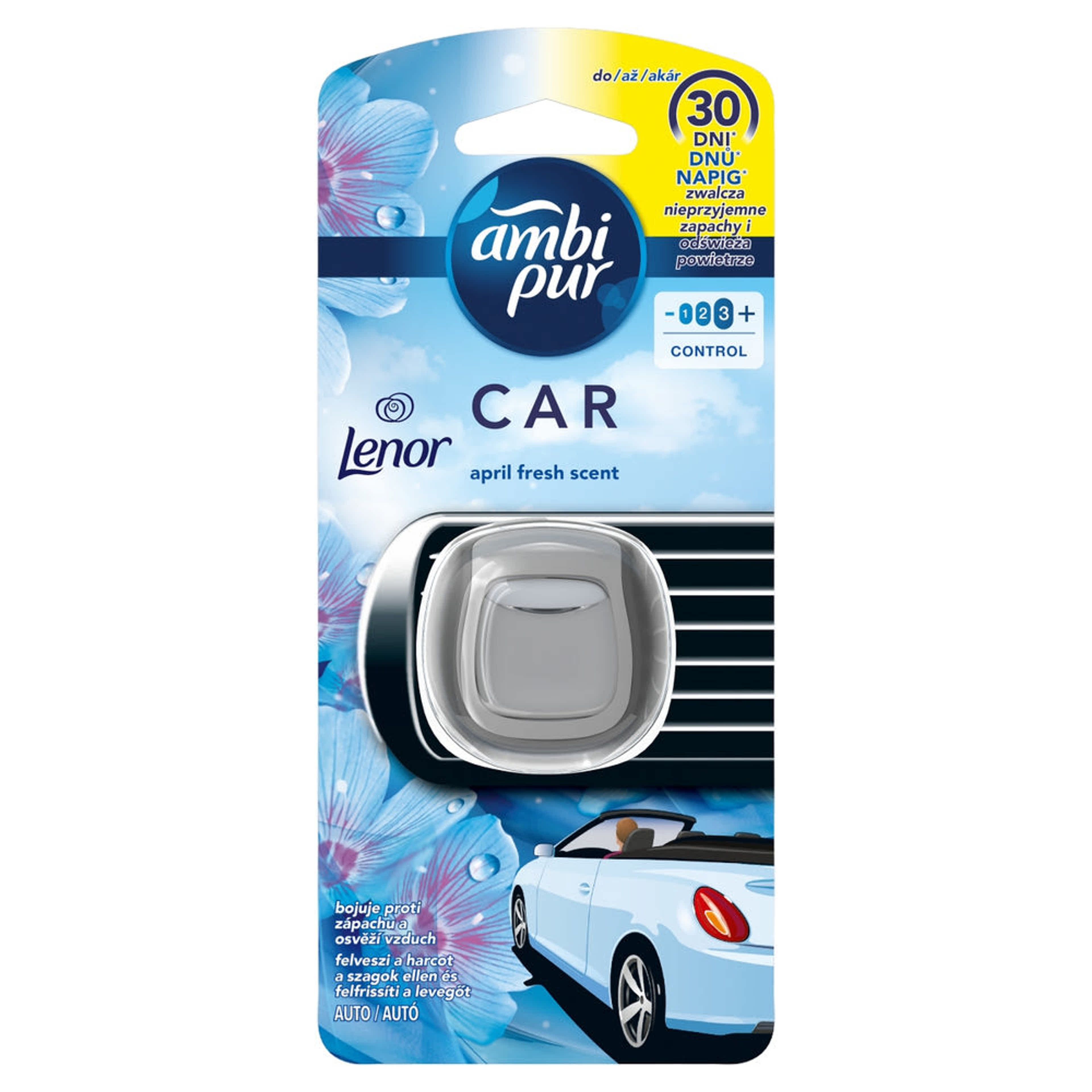 Az Odourclear technológiával készült Ambi Pur megszünteti az autóban rekedt kellemetlen szagokat, és friss illatot hagy maga után akár 70 napon át. Az April Fresh könnyed, zöld leveleket idéző illatát a Lenor természetesen friss, tavaszi illatvilága ihlette. A legtöbb autóillatosítóval szemben – melyek többnyire csupán elfedik a szagokat – az Ambi Pur ténylegesen megszünteti azokat, és kellemesen friss illatot hagy maga után a gépjármű utasterében. Ez az apró és diszkrét, a gépjármű szellőzőrácsára könnyen felcsíptethető eszköz a különleges Odourclear technológiának köszönhetően még a legmakacsabb szagokat is megszünteti (amit például az ételek, háziállatok, dohányfüst vagy hulladékok okoznak), és felfrissíti az utastér levegőjét. Az illat intenzitása az eszköz oldalán található szabályozó segítségével állítható. Az Ambi Pur autóillatosító könnyen használható, működése nem igényel elemet vagy áramot. Akár 30 napon át tart, így Ön és utasai kellemes illatnak örvendhetnek. Próbálja ki az Odourclear technológiával ellátott Ambi Pur termékek széles választékát, többek között az Ambi Pur szövetfrissítőt, amely az autó kárpitjából távolítja el a szagokat. Otthonában pedig használja az Ambi Pur aeroszolos légfrissítőt, illetve a Small Spaces illatosítót. Próbálja ki a 3Volution elektromos illatpárologtató készülékeket is, amelyek akár 90 napon át szüntetik meg a szagokat.