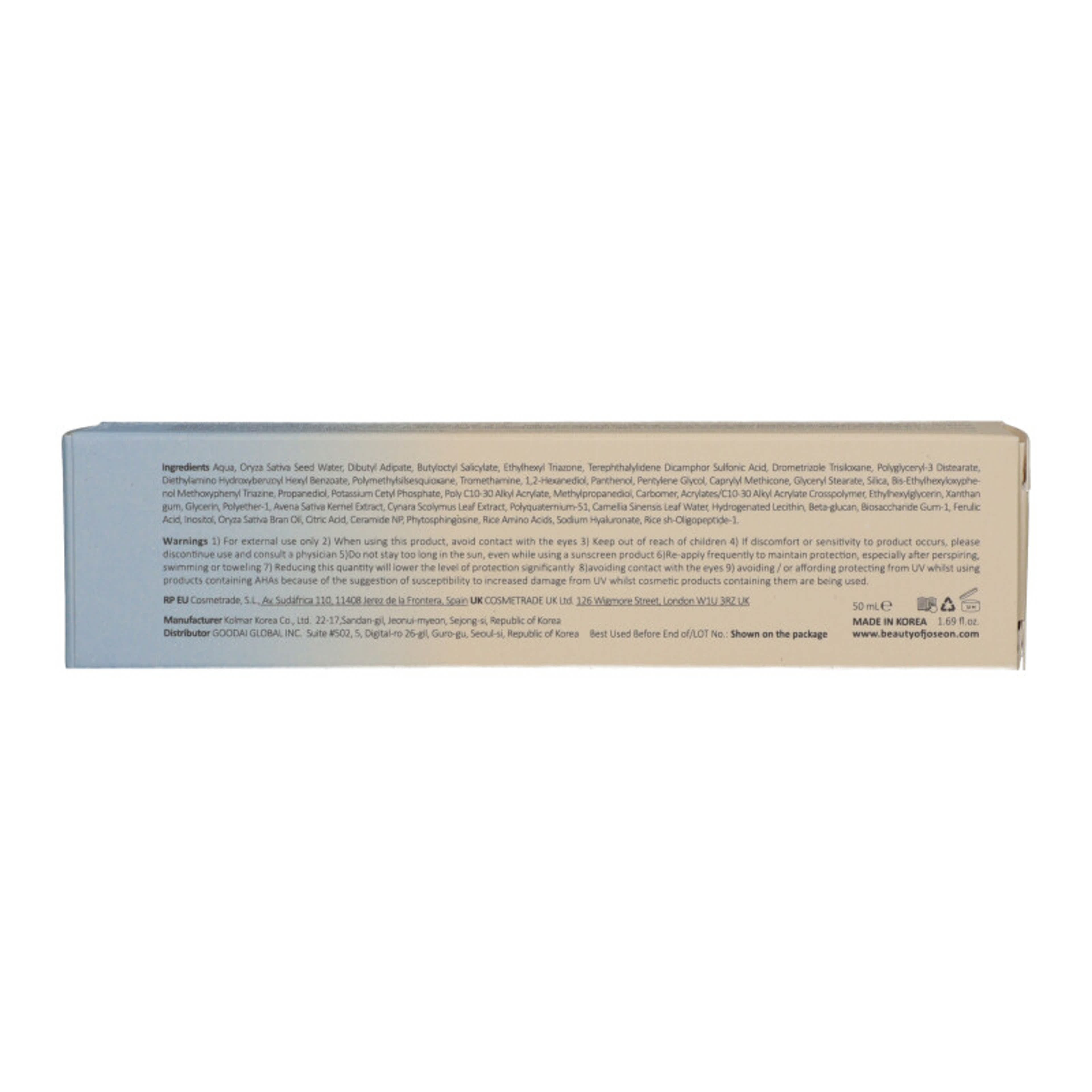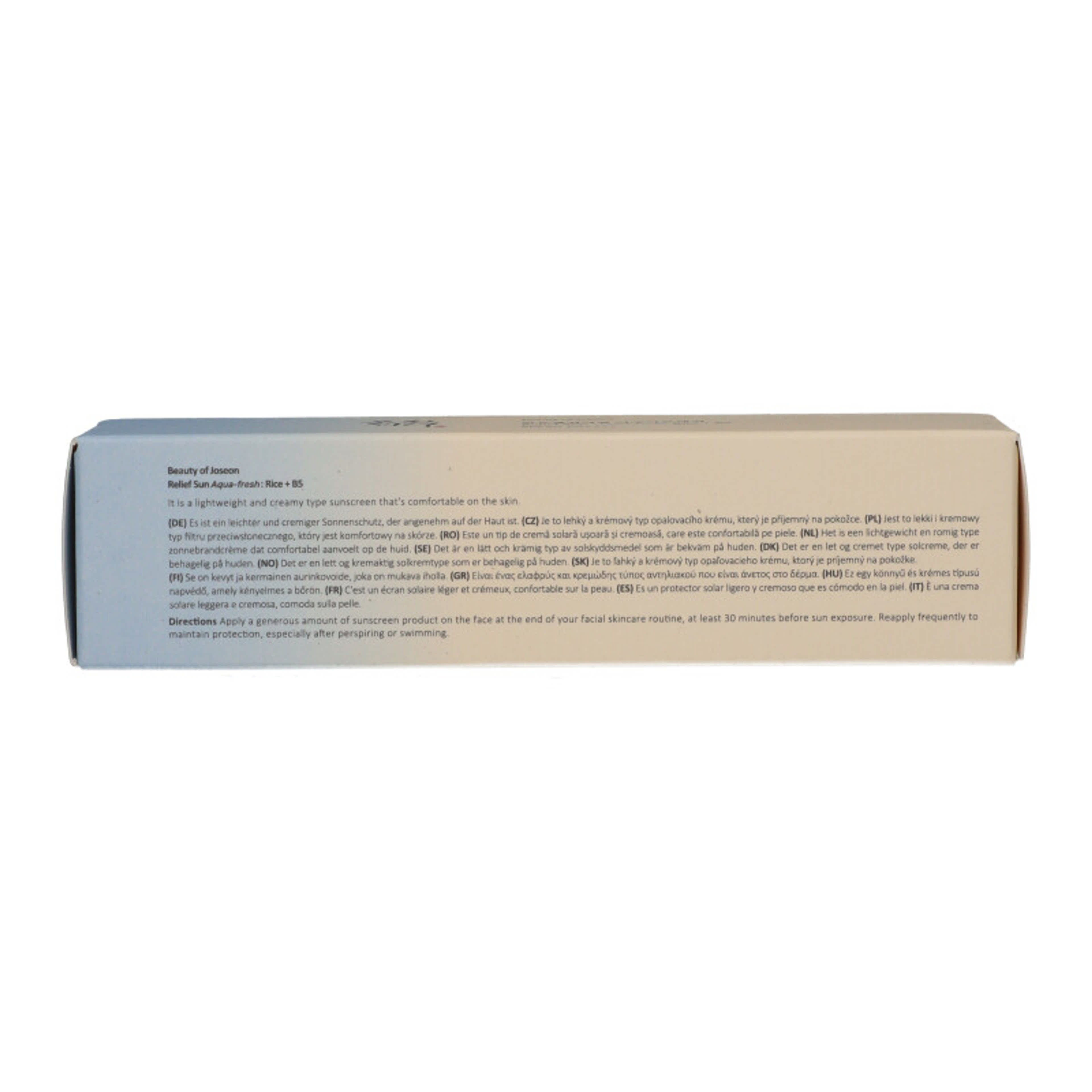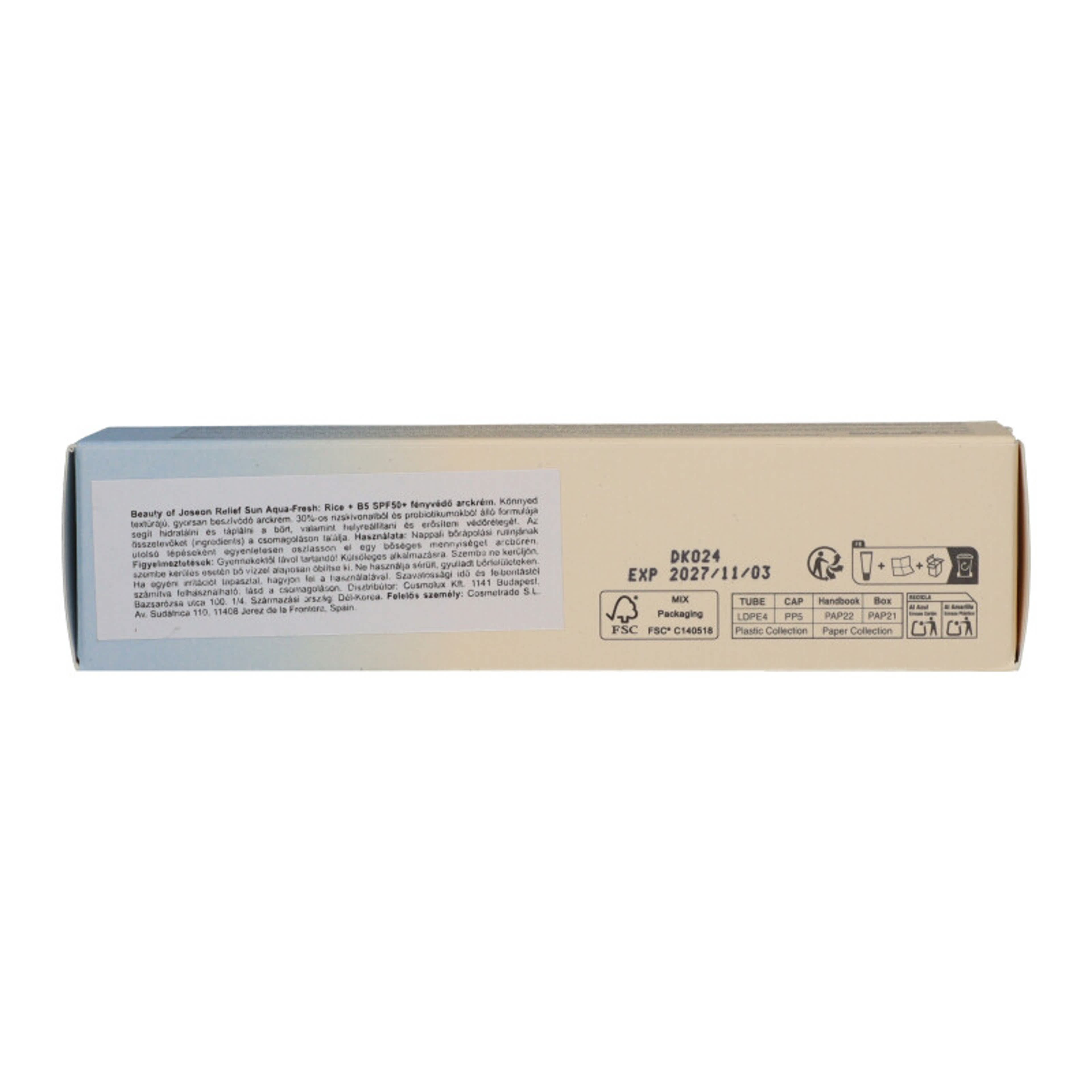 BEAUTY OF JOSEON Relief Sun Aqua-Fresh Rice + B5 SPF50+ Fényvédő Arckrém 50 ml: Könnyed, hidratáló fényvédő krém rizskivonattal és B5-provitaminnal, amely magas, széles spektrumú védelmet nyújt az UV-sugarak ellen. Gyengéd formulája nemcsak az arcbőrt védi a káros napsugaraktól, hanem megnyugtatja és mélyen hidratálja is azt, így a bőr puha, friss és ragyogó marad. A rizskivonat táplálja a bőrt, elősegítve az egyenletesebb és simább arcbőrtónust, míg a B5-provitamin erősíti a bőr természetes védőrétegét és fokozza a hidratációt. Használat: Vigyen fel bőséges mennyiséget az arcára reggeli bőrápolási rutinja utolsó lépéseként, legalább 20 perccel a napfénynek való kitettség előtt. Hosszabb napozás esetén 2-3 óránként ismételje meg az alkalmazást a folyamatos védelem érdekében.
