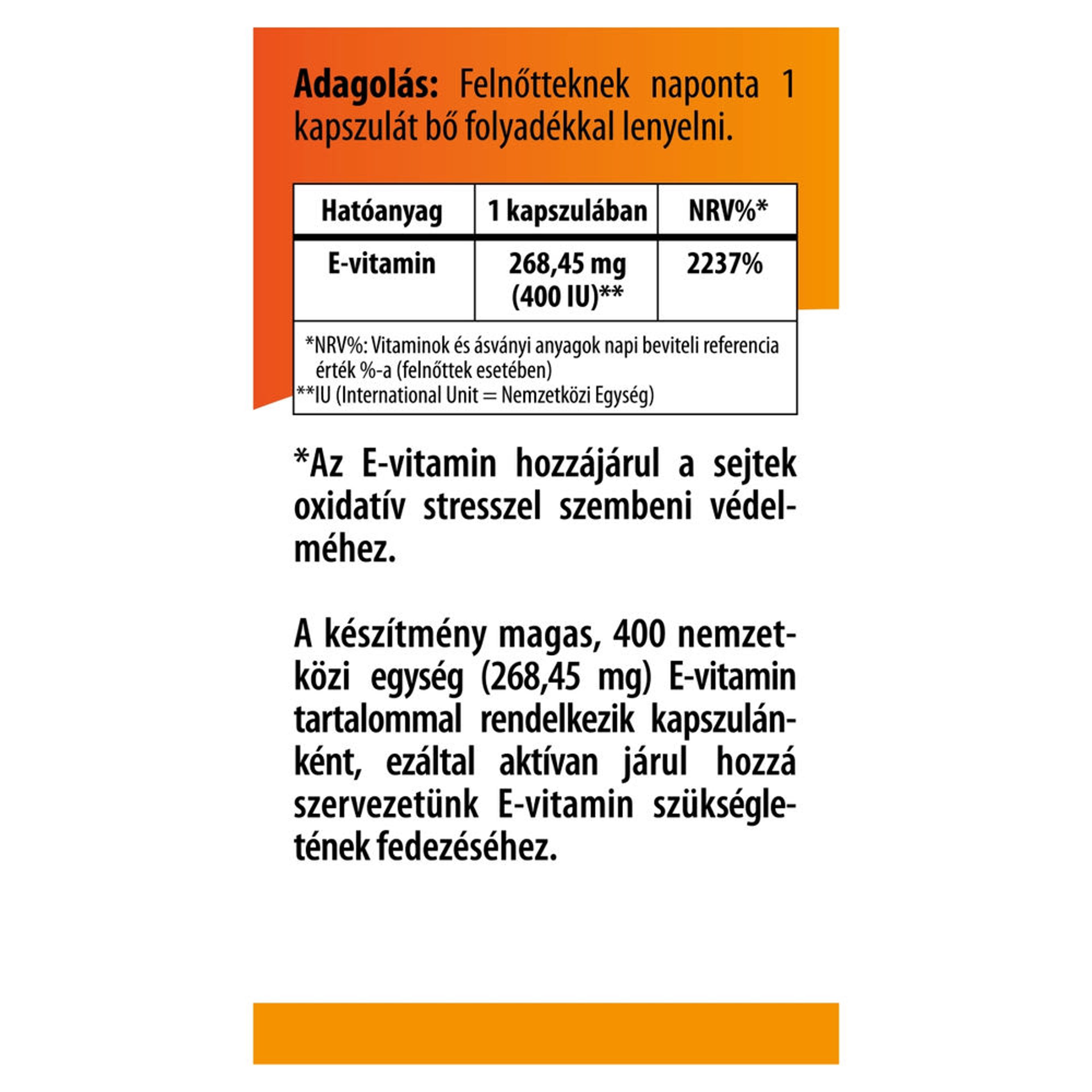 | E-vitamin | 268,45 mg (400 IU)** | 2237% | |