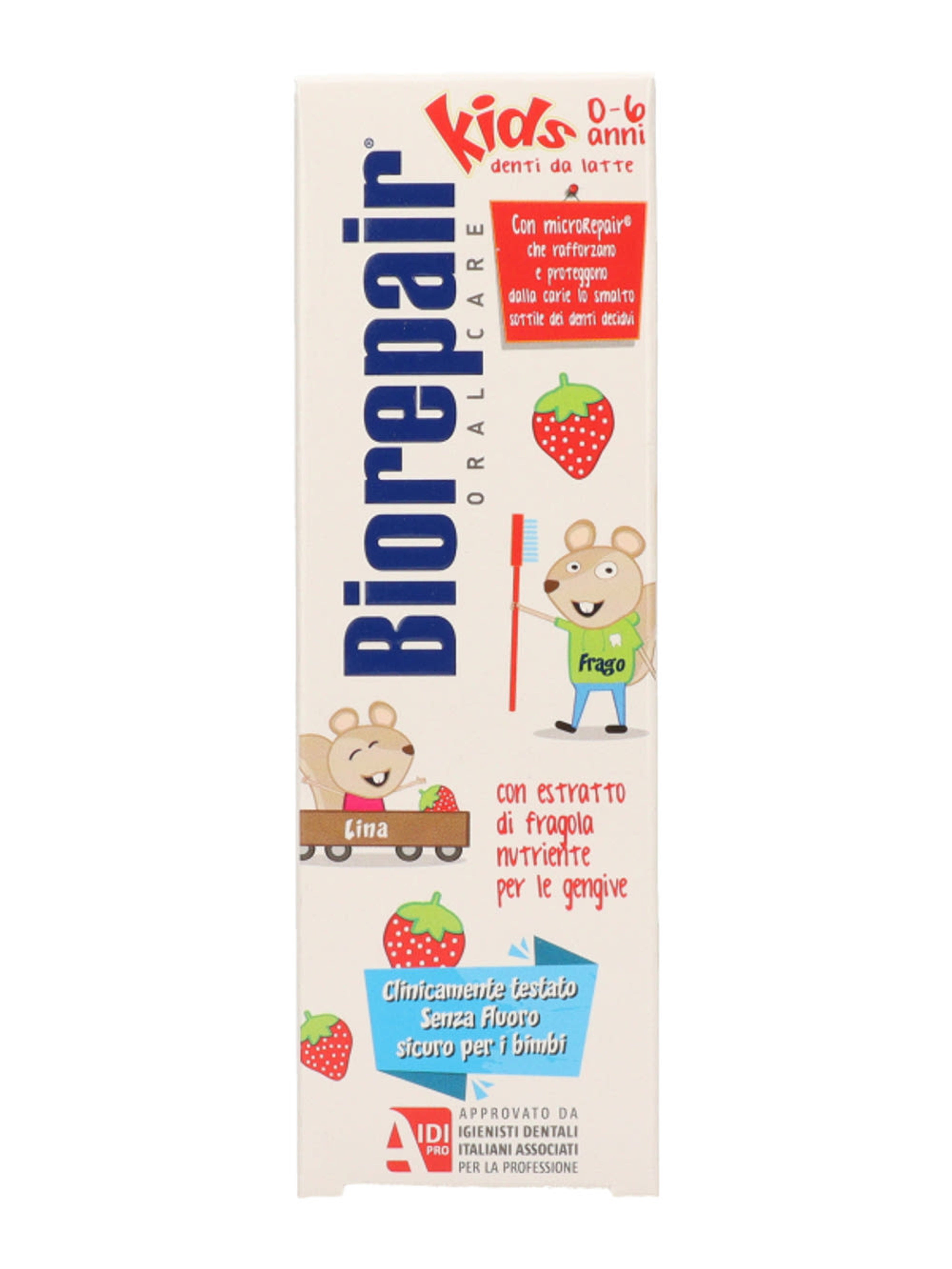 A Biorepair® Kids fogkrém véd a fogszuvasodástól és ideális már az első kis fogak ápolására. A gyermekek fogzománca vékonyabb és sérülékenyebb, mint a felnőtteké. Fontos a fogzománc újra ásványosítása, hogy az ellenállóbb legyen a savakkal és cukrokkal szemben. A Biorepair® Kids az egyetlen microRepair®-t tartalmazó fogkrém, amely erősíti a tejfogak zománcát, elősegítve a maradandó fogak egészséges fejlődését. Hatékonysága klinikailag tesztelt. Gyengéd, gyümölcsös formulája eperkivonatot tartalmaz, amely tonizálja és táplálja a fogínyt. Vegán. Nem tartalmaz: fluoridot, karcoló szilíciumot, titán-dioxidot, Nátrium-lauril- szulfát-ot, parabéneket, színezéket.