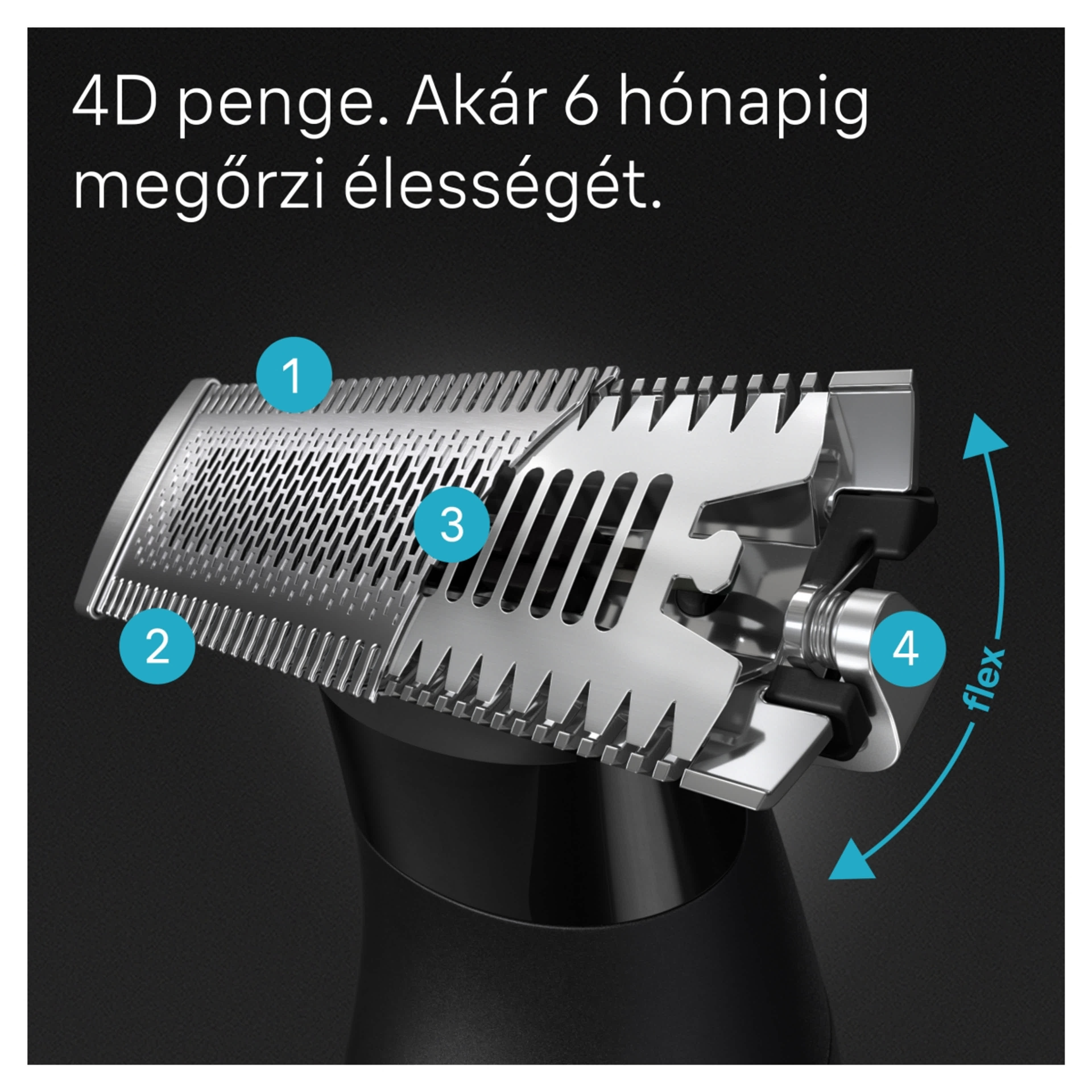 - Egyszerű és kényelmes: könnyen érhet el nagyszerű eredményeket és precíz vonalakat még a problémás területeken is a csuklós Flex Head és a kétoldalú fésűkkel, amelyek minden irányban képesek trimmelni