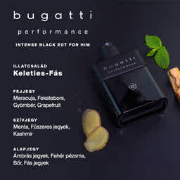 A bugatti performance Intense Black egzotikus fejjegyében a maracuja, a fekete bors és a friss grapefruit árnyalatai ötveződnek. A szívjegyben a friss menta egyesül a kasmír finom jegyeivel, amelyet az izgalmas fűszeres elemek tesznek különlegessé. A magabiztos alapjegy fás és balzsamos jegyekből épül fel, a férfias bőr és a fás elemek révén tökéletes lezárást biztosítva a keleties-fás illatnak.