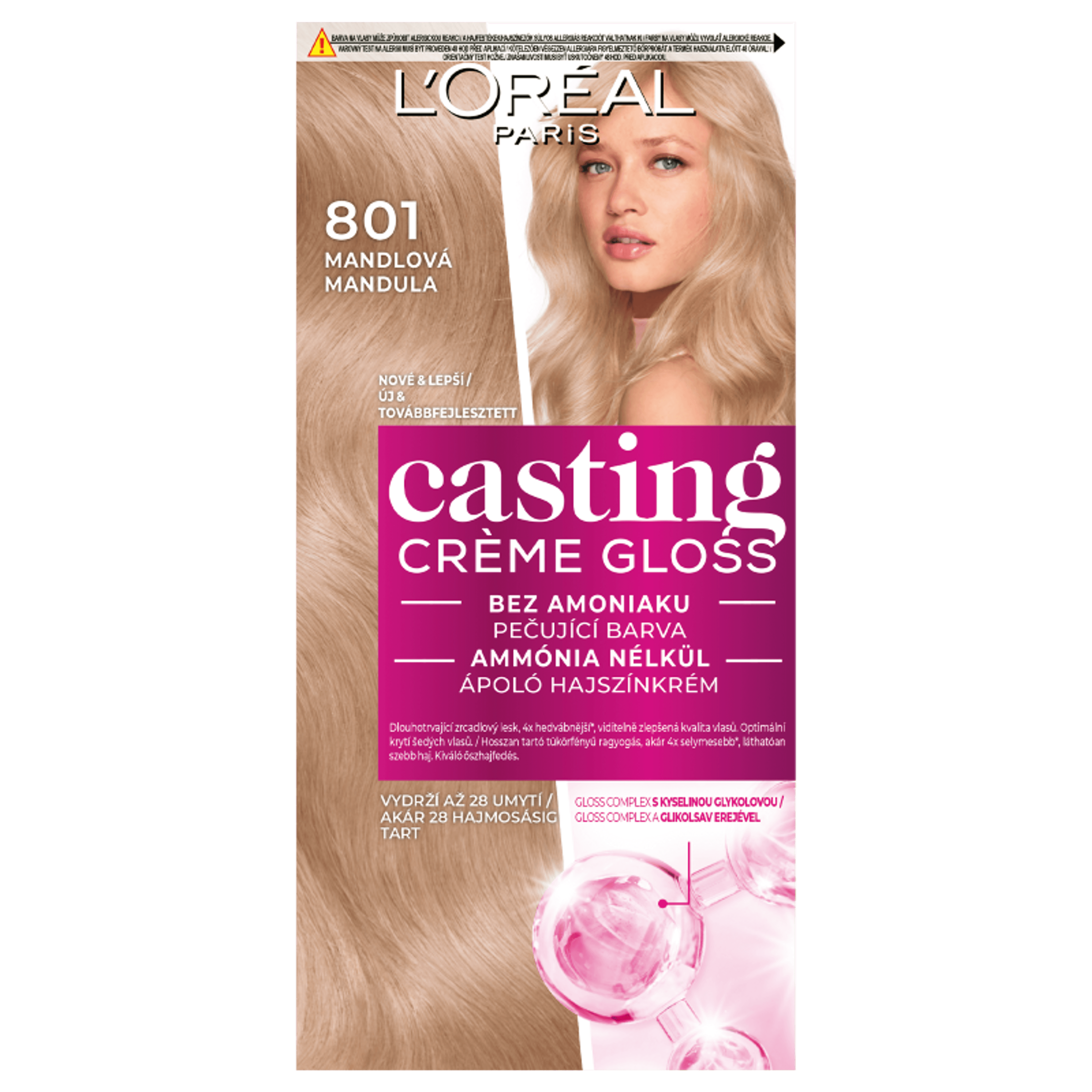 KÖTELEZŐ HASZNÁLATI UTASÍTÁSOK A HAJFESTÉKEK/HAJSZÍNEZŐK SÚLYOS ALLERGIÁS REAKCIÓT VÁLTHATNAK KI. Olvassa el és kövesse az utasításokat! Ezt a terméket nem 16 éven aluli személyeknél való alkalmazásra szánták. AZ IDEIGLENES “FEKETE HENNA” TETOVÁLÁS NÖVELHETI AZ ALLERGIA KIALAKULÁSÁNAK KOCKÁZATÁT. • Ne használjon hajfestéket/hajszínezőt, ha : • Arcán kiütés van, vagy fejbőre érzékeny, irritált vagy sérült. • Hajfestés után bármikor, bármilyen reakciót észlelt. • Korábban, ideiglenes « fekete henna » tetoválás során valamilyen reakciót észlelt. EGY ALLERGIA FIGYELMEN KÍVÜL HAGYÁSA ÉLETVESZÉLYES LEHET. Kötelezően végezzen ALLERGIÁRA FIGYELMEZTETŐ BŐRPRÓBÁT mindenképpen 48 órával a termék minden használata előtt, akkor is, ha már használt előtte bármikor hajfestéket. Ne felejtse el előre megvenni hajfestékét, hogy elvégezhesse az allergiára figyelmeztető bőrpróbát 48 órával a hajfestés előtt. (Olvassa el és kövesse a használati útmutatót.) Bármilyen reakció vagy kétely esetén beszéljen orvossal bármely hajfesték/hajszínező használata előtt. -A színelőhívó a hidrogén-peroxidot tartalmaz. - A hajfesték fenilén-diaminokat, fenilén-diaminokat (toluol-diamint), rezorcint, és ammóniát tartalmaz. - A termék ne kerüljön szembe, ne használja szempilla és szemöldök festésére. - Amennyiben a festék szembe jut, azonnal öblítse ki bő vízzel. -Viselje a dobozban található kesztyűt. - A hajfestés végén alaposan öblítse le a hajat! - Dauerolás, hajkiegyenesítés vagy tartós hajkiegyenestés után várjon legalább 2 hetet a termék használatával. - Ne használja hennával vagy hajszín-regenerálóval festett hajon. - Gyermekektől elzárva tartandó! KÖVESSE A HASZNÁLATI ÚTMUTATÓT! Az összetevők listája a csomagolás alján található.