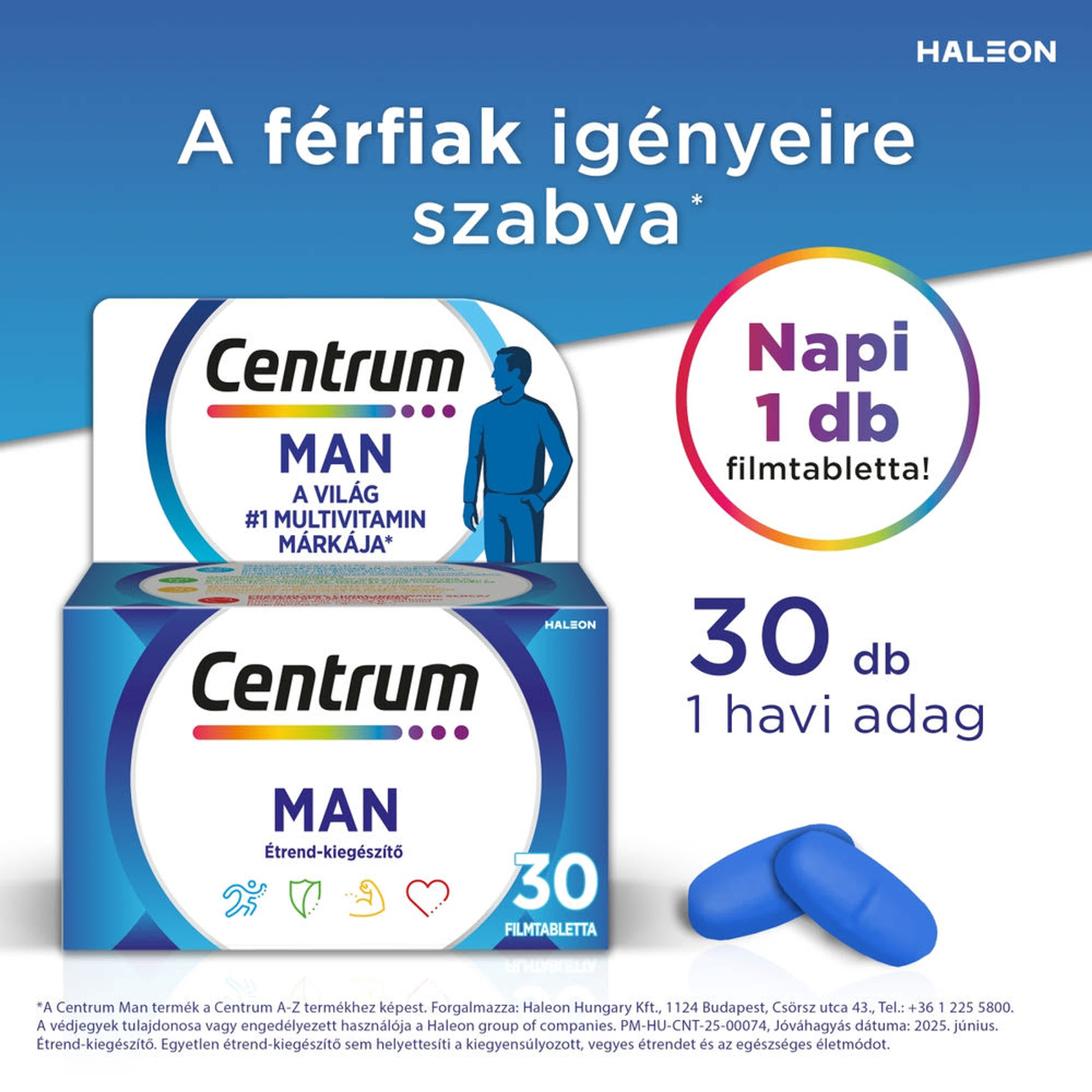 Termékleírás: A Centrum Férfiaknak 30x egy speciálisan férfiak számára kifejlesztett étrend-kiegészítő, amely vitaminok és ásványi anyagok széles spektrumát tartalmazza. Támogatja a vitalitást, az immunrendszer működését, az egészséges izomzatot és a szívműködést.