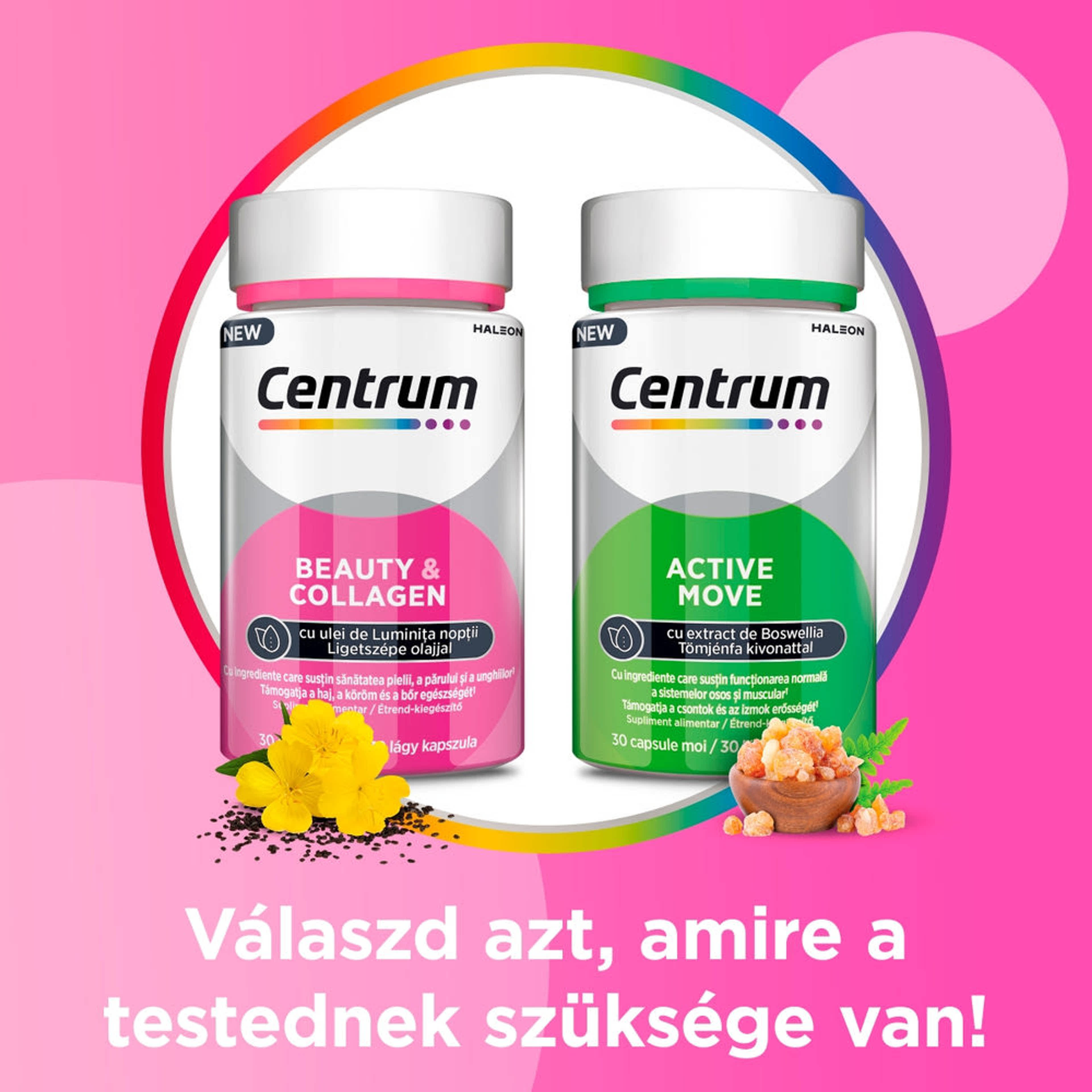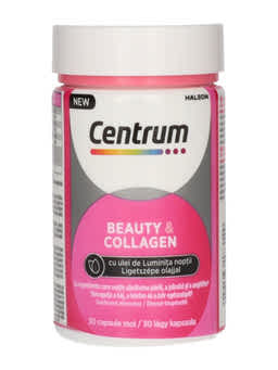 Termékleírás: A Centrum Beauty & Collagen egy felnőttek számára kifejlesztett étrend-kiegészítő, amely válogatott vitaminokat, ásványi anyagokat, kollagént és ligetszépe olajat tartalmaz. Támogatja a bőr, a haj és a körmök egészségét, segítve a természetes szépség megőrzését.