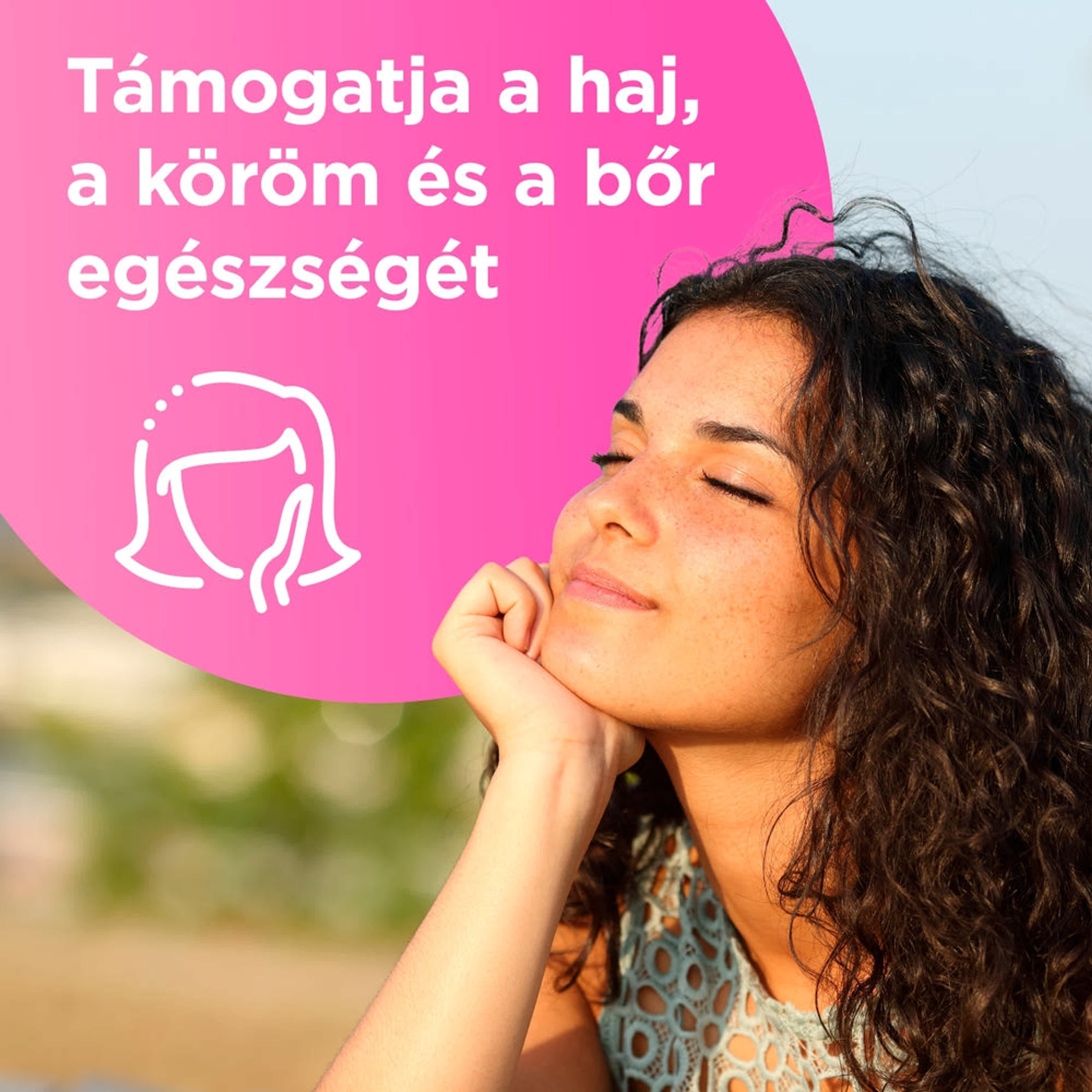 Válogatott vitaminokkal, ásványi anyagokkal, kollagénnel és ligetszépe olajjal a bőr, a haj és körmök egészségéért.