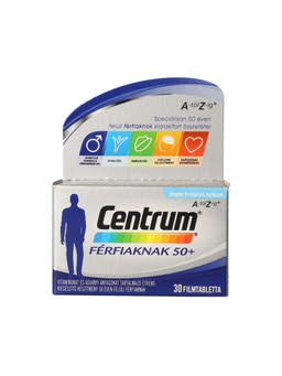 Termékleírás: A Centrum Férfiaknak 50+ egy speciálisan 50 év feletti férfiak számára kifejlesztett étrend-kiegészítő, amely vitaminok és ásványi anyagok széles spektrumát tartalmazza. Támogatja a vitalitást, az immunrendszer működését, a szellemi teljesítményt és a szívműködést.