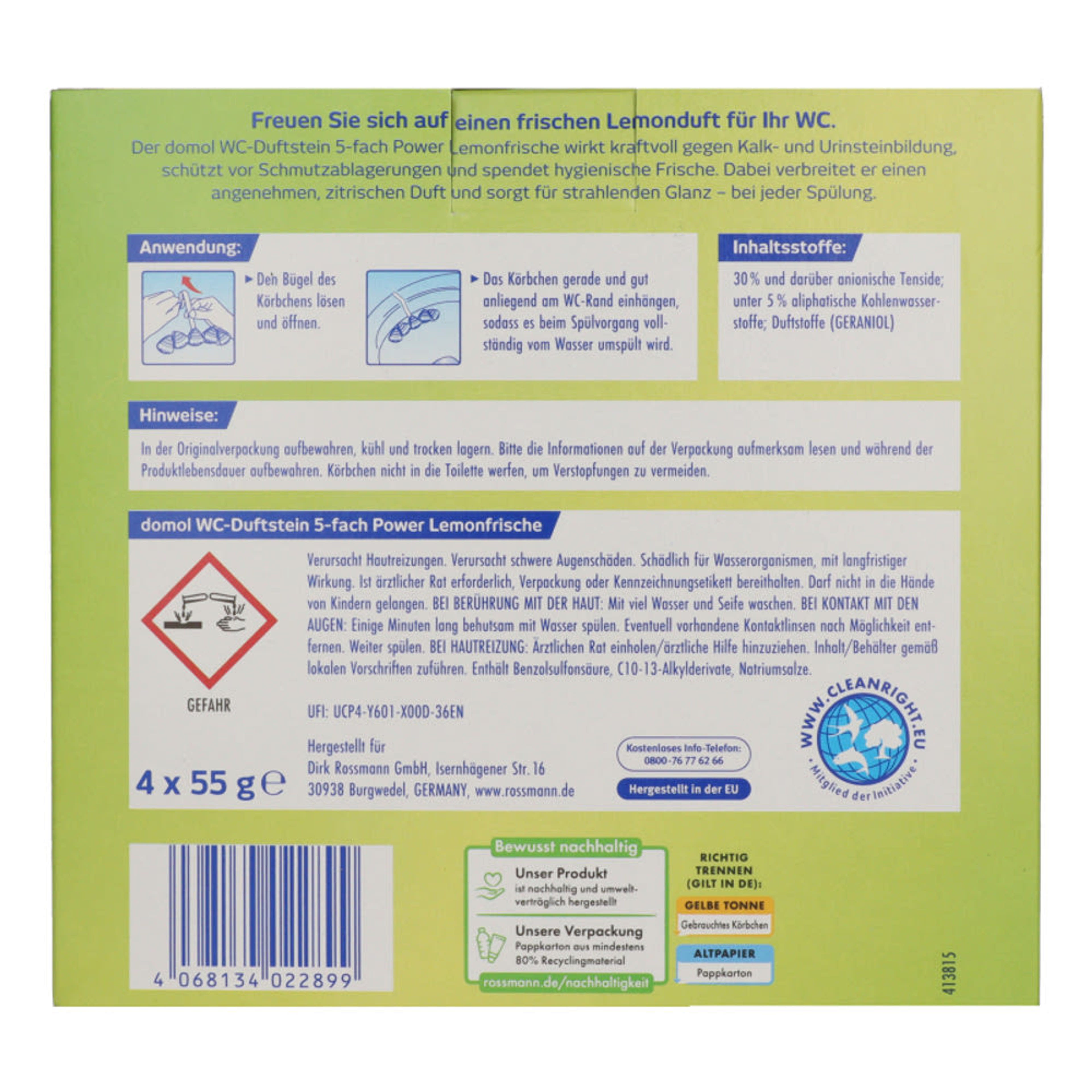 A domol WC-illatkövecske 5-féle Power Lemon Frische hatékonysággal lép fel a vízkő- és vizeletkő-képződés ellen, megakadályozza a szennyeződések lerakódását, higiénikus frissességet biztosít és kellemes, citrusos illatot áraszt. Minden öblítésnél ragyogó tisztaságról gondoskodik.