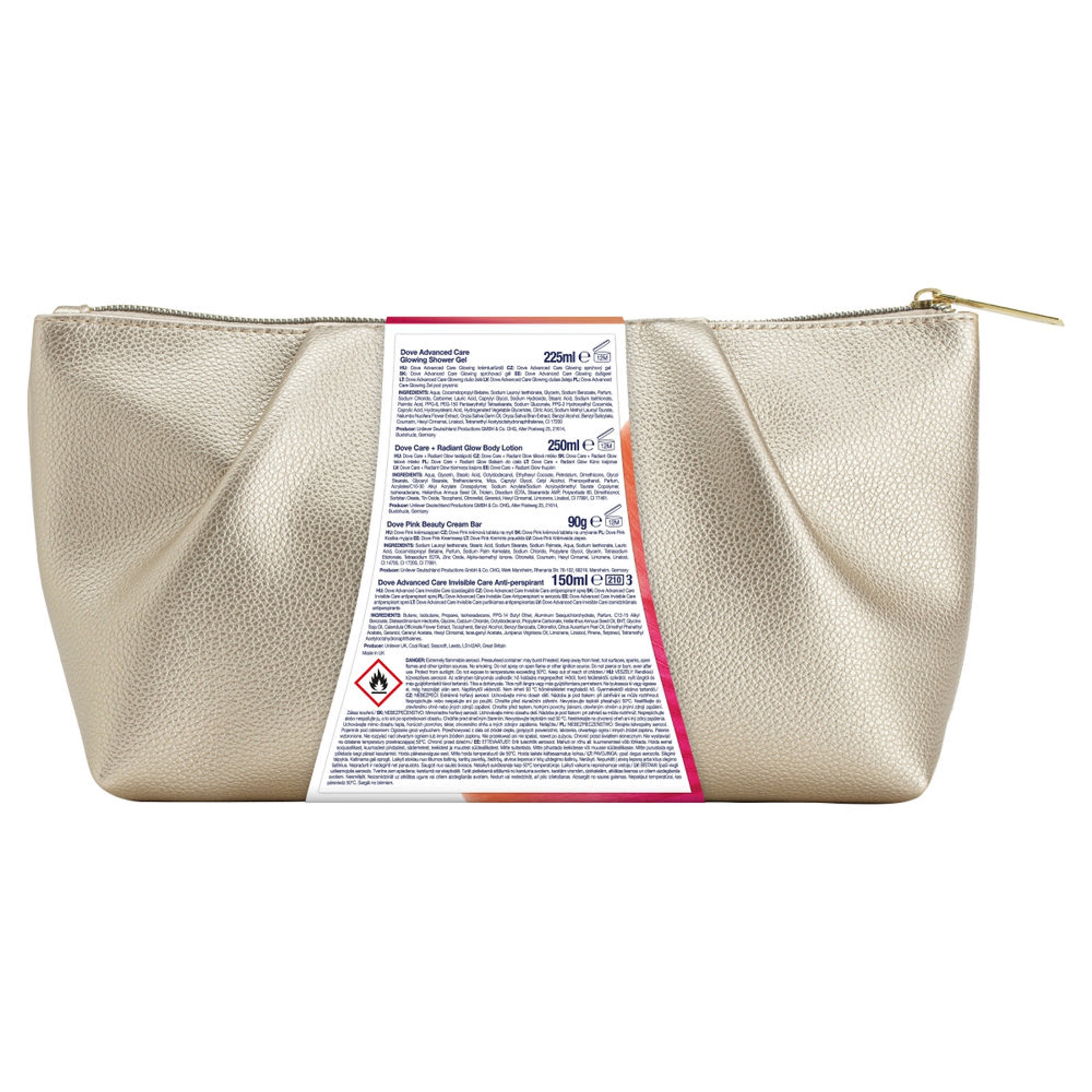 Dove Care + Radiant Glow testápoló: Aqua, Glycerin, Stearic Acid, Octyldodecanol, Ethylhexyl Cocoate, Petrolatum, Dimethicone, Glycol Stearate, Glyceryl Stearate, Triethanolamine, Mica, Caprylyl Glycol, Cetyl Alcohol, Phenoxyethanol, Parfum, Acrylates/C10-30 Alkyl Acrylate Crosspolymer, Sodium Acrylate/Sodium Acryloyldimethyl Taurate Copolymer, Isohexadecane, Helianthus Annuus Seed Oil, Triolein, Disodium EDTA, Stearamide AMP, Polysorbate 80, Dimethiconol, Sorbitan Oleate, Tin Oxide, Tocopherol, Citronellol, Geraniol, Hexyl Cinnamal, Limonene, Linalool, CI 77891, CI 77491