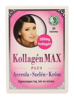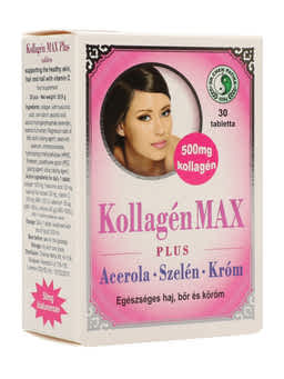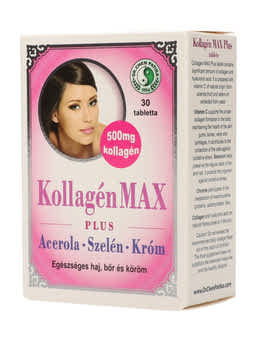 A Kollagén Max Plus tabletta jelentős mennyiségű kollagént és hialuronsavat tartalmaz. Természetes eredetű C-vitaminnal (acerola gyümölcsből), élesztőből kivont szelénnel készült. A C-vitamin támogatja a megfelelő kollagénképződést a szervezetben, ezáltal bőr, a fogíny, a csontok és fogak, az erek és a porcok egészségének fenntartását. Hozzájárul a sejtek oxidatív stresszel szembeni védelméhez. A szelén segít megőrizni a haj és a köröm megfelelő állapotát, védi a szervezetet az oxidatív stresszel szemben. A króm részt vesz a makrotápanyagok (fehérjék, szénhidrátok, zsírok) anyagcseréjében. A kollagén és a hialuronsav a bőrben természetesen jelen lévő vázfehérjék.