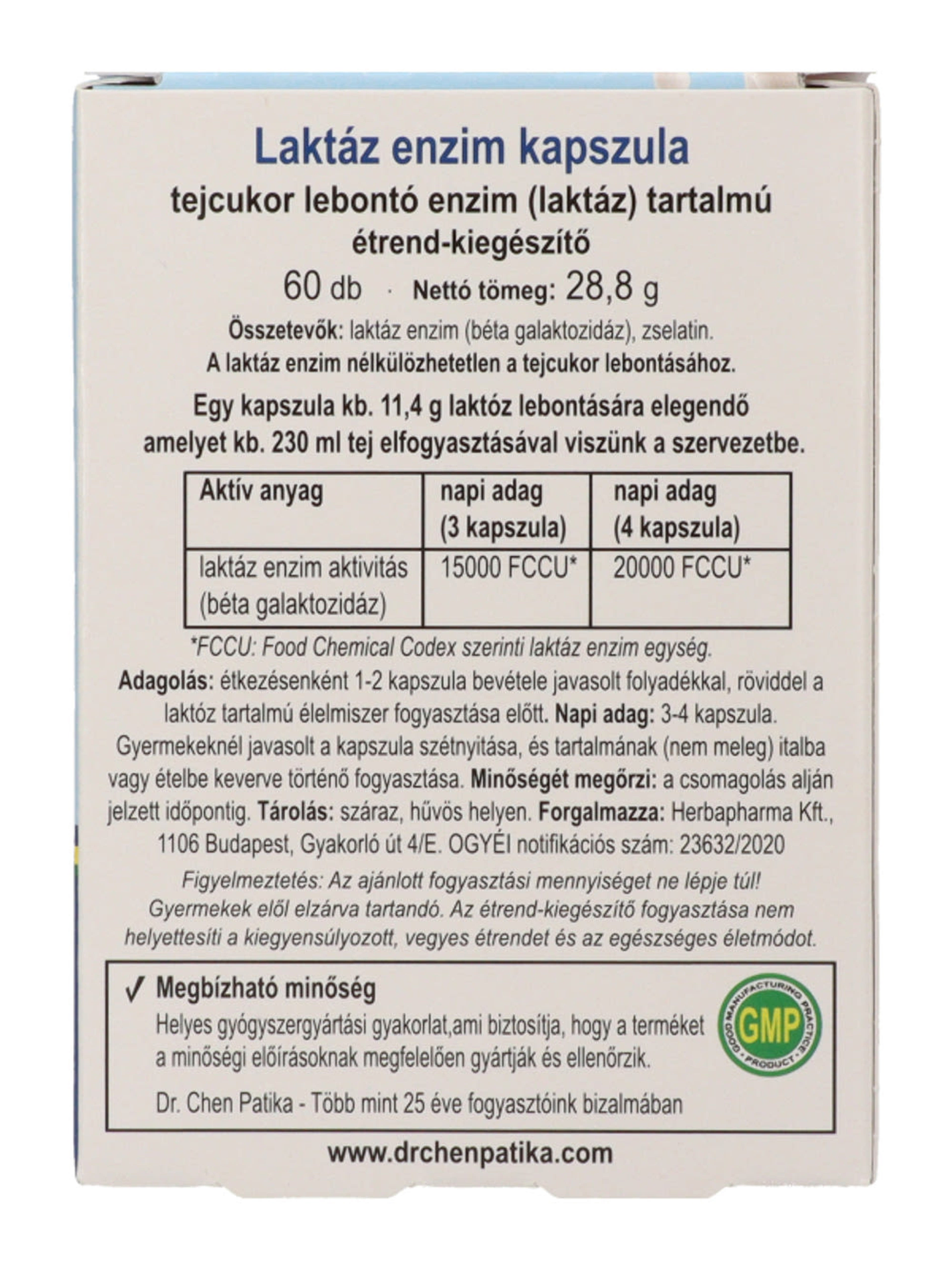 Egy kapszula kb. 11,4 g laktóz lebontására elegendő, amelyet kb. 230 ml tej elfogyasztásával viszünk a szervezetbe.