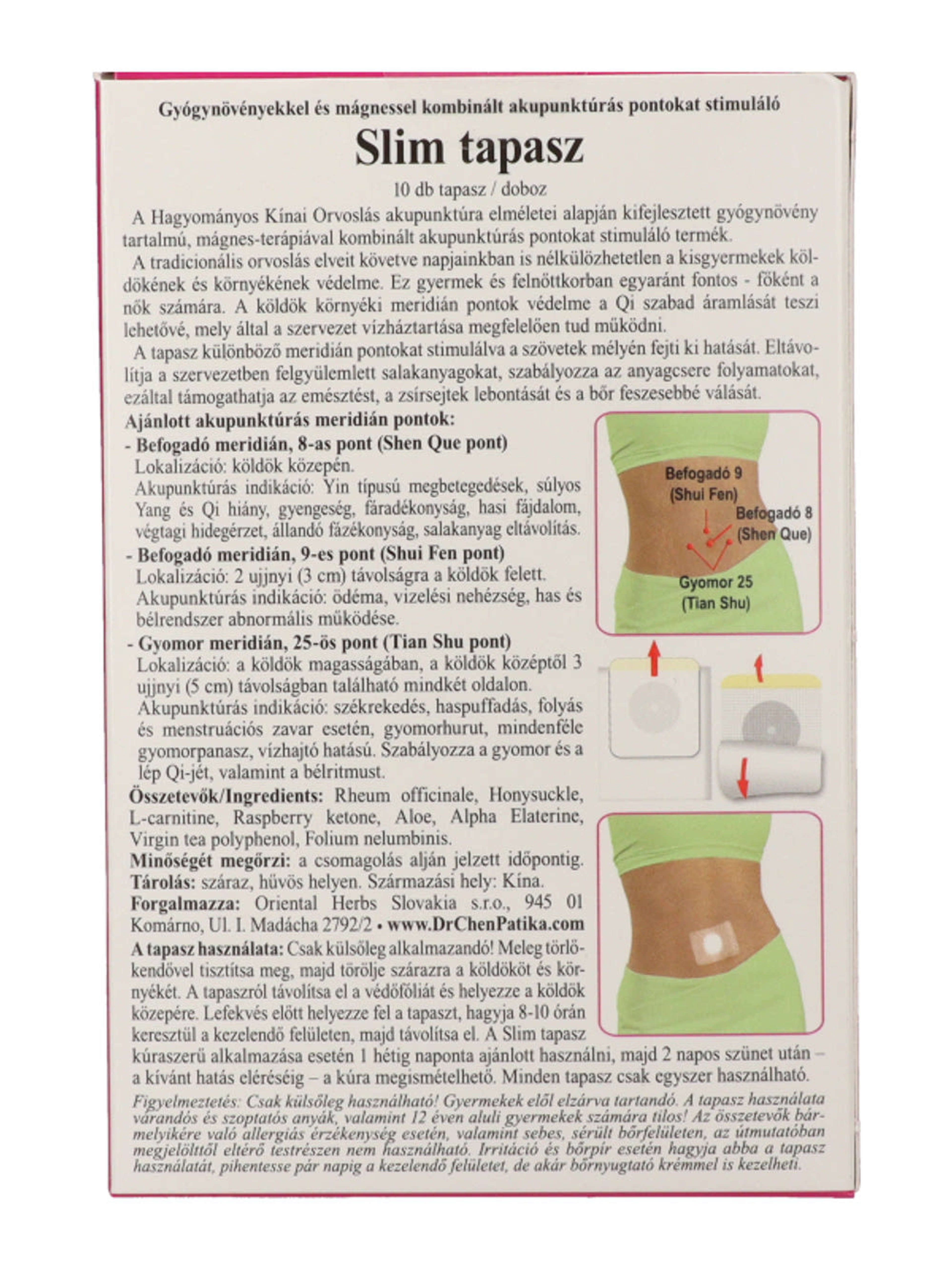 A tapasz különböző meridián pontokat stimulálva a szövetek mélyén fejti ki hatását. Eltávolítja a szervezetben felgyülemlett salakanyagokat, szabályozza az anyagcsere folyamatokat, ezáltal támogathatja az emésztést, a zsírsejtek lebontását és a bőr feszesebbé válását.