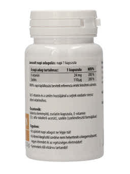 Az E-vitamin és a szelén hozzájárul a sejtek oxidatív stressz elleni védelméhez, mérsékli a szabadgyökök károsító hatását és lassítja az öregedési folyamatokat. Étrend-kiegészítő. AZ ÉTREND-KIEGÉSZÍTŐ SZEDÉSE NEM HELYETTESÍTI A KIEGYENSÚLYOZOTT VEGYES ÉTRENDET ÉS AZ EGÉSZSÉGES ÉLETMÓDOT!