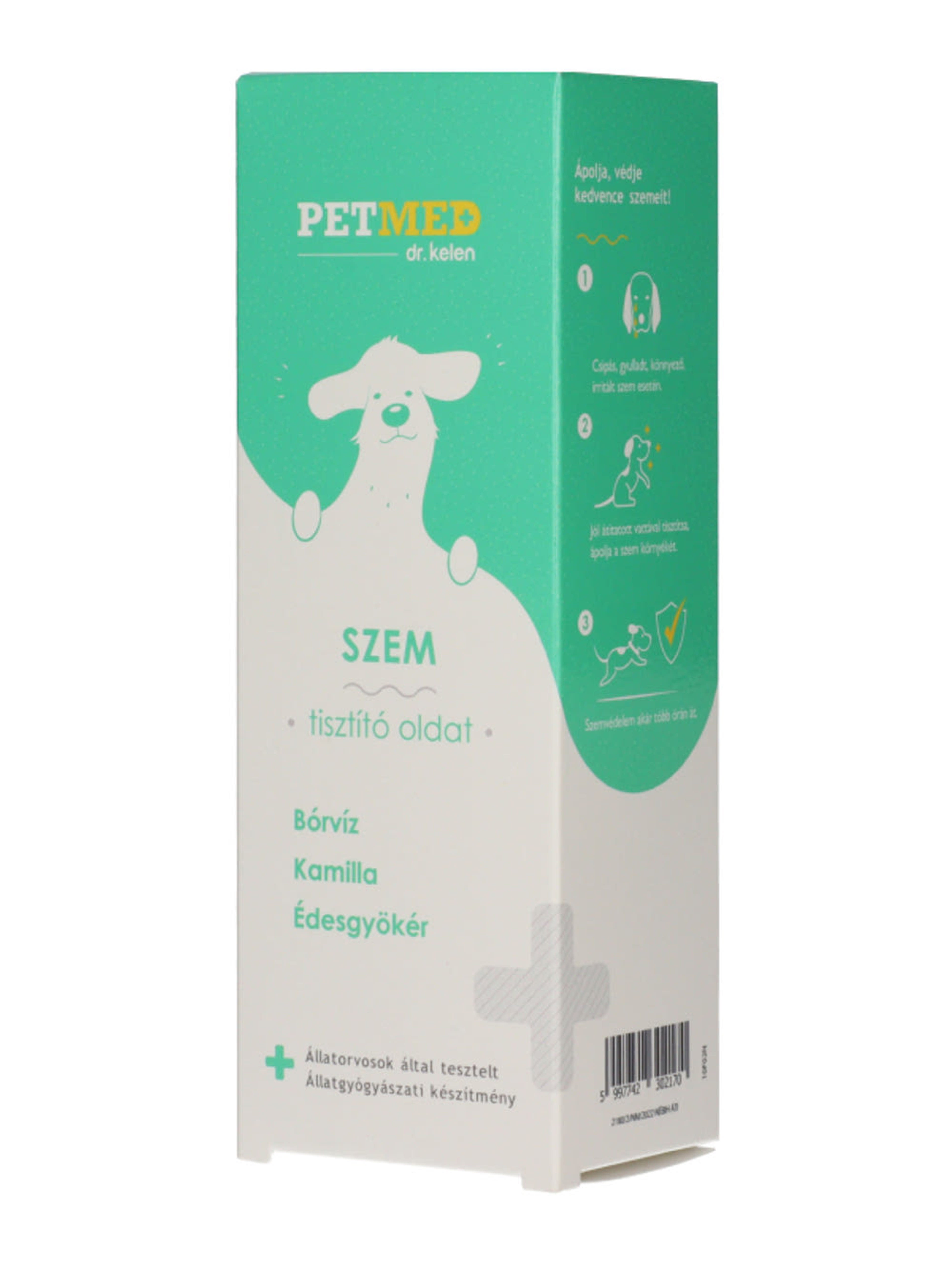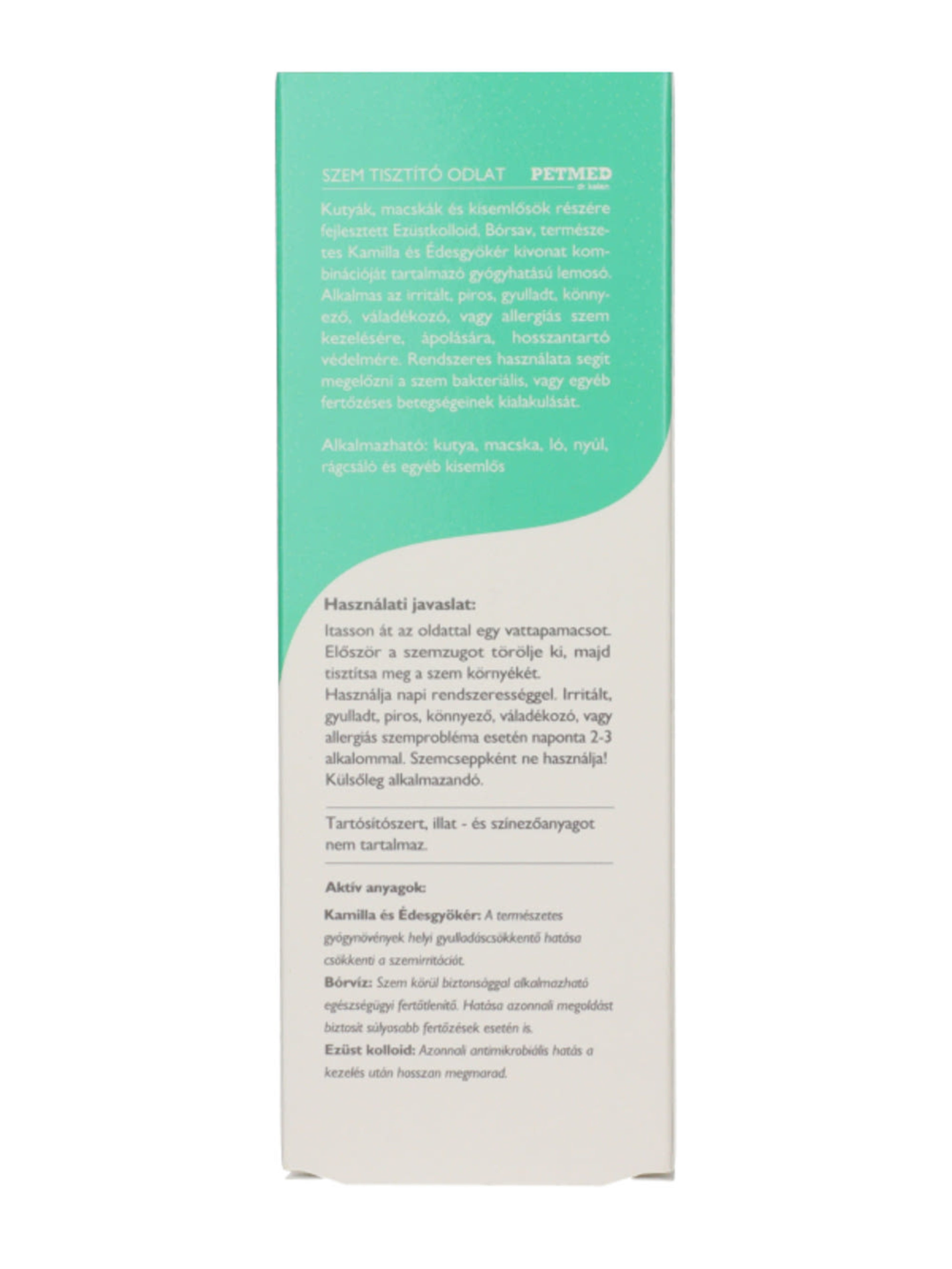 Bórsav, Ezüstkolloid, természetes Kamilla és Édesgyökér kivonat kombinációját tartalmazó gyógyhatású lemosó, alkalmas az irritált, piros, gyulladt, könnyező, váladékozó, vagy allergiás szem kezelésére, ápolására, hosszantartó védelmére. Rendszeres használata segít megelőzni a szem bakteriális, vagy egyéb fertőzéses betegségeinek kialakulását. Alkalmazható: kutya, macska, ló, nyúl, rágcsáló és egyéb kisemlős. Tartósítószert, illat- és színezőanyagot nem tartalmaz.
