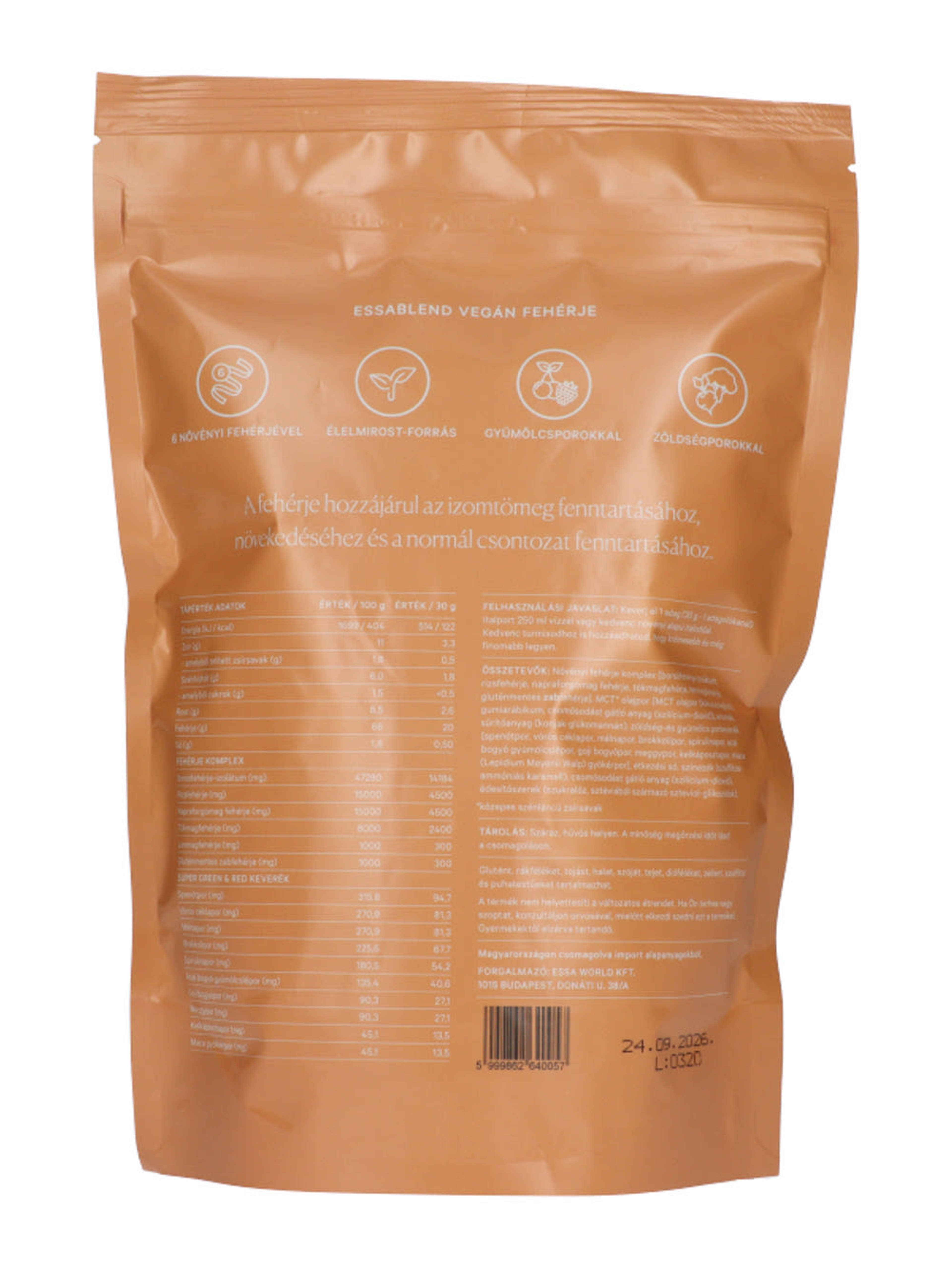 Növényi fehérje komplex [borsófehérje-izolátum, rizsfehérje, napraforgómag fehérje, tökmagfehérje, lenmagfehérje, gluténmentes zabfehérje], MCT* olajpor [MCT olajpor (kókuszolajból), gumiarábikum, csomósodást gátló anyag (szilícium-dioxid)], aromák, sűrítőanyag (konjak-glükomannán), zöldség-és gyümölcs porkeverék [spenótpor, vörös céklapor, málnapor, brokkolipor, spirulinapor, acai bogyó gyümölcslépor, goji bogyópor, meggypor, kelkáposztapor, maca (Lepidium Meyenii Walp) gyökérpor], étkezési só, színezék (szulfitos-ammóniás karamell), csomósodást gátló anyag (szilícium-dioxid), édesítőszerek (szukralóz, sztéviából származó szteviol-glikozidok).