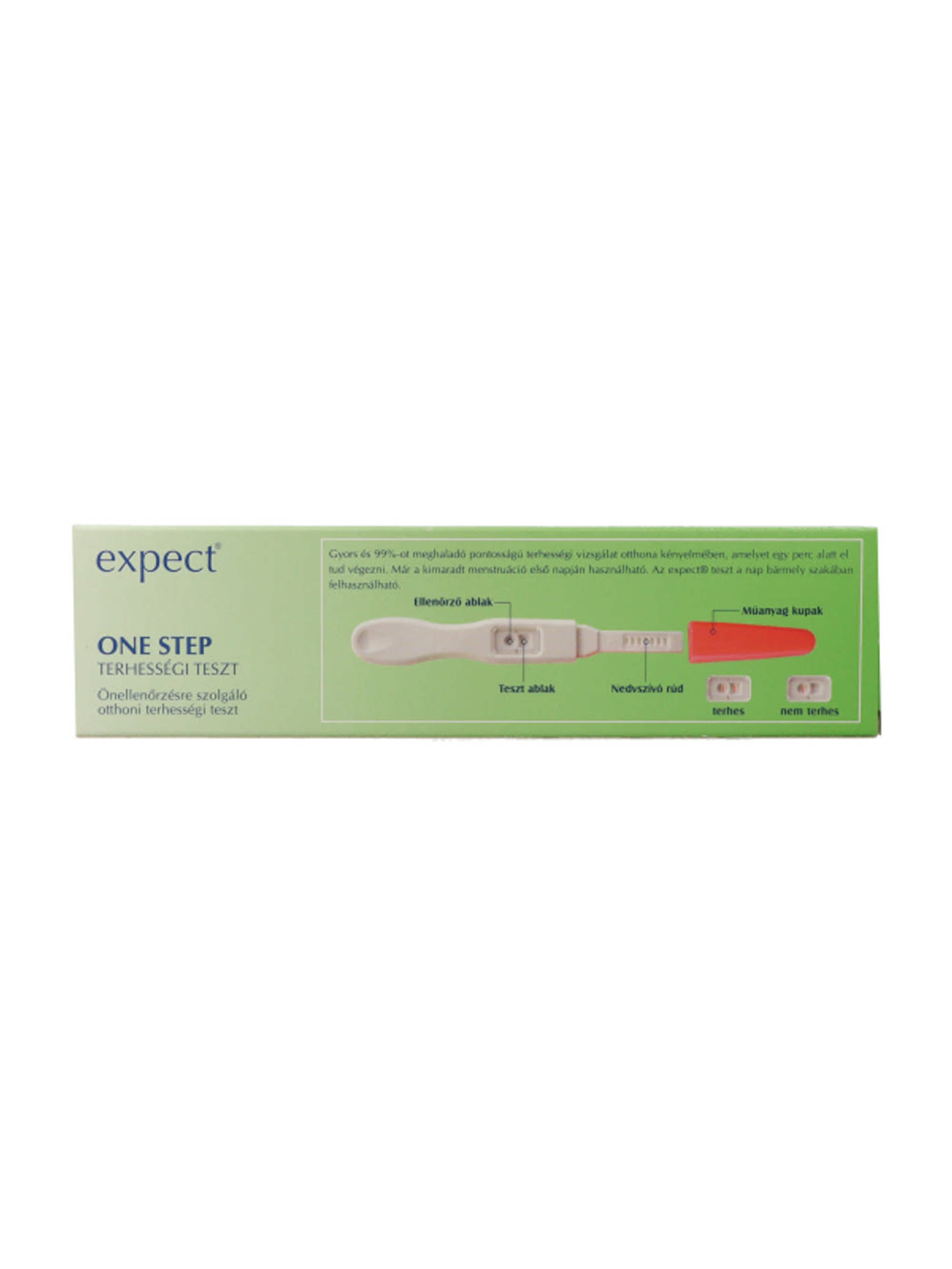 Az Expect középsugaras terhességi teszt 25 mIU/ml érzékenységű, vagyis már a várt menstruáció előtt 2-3 nappal képes kimutatni a terhességet. Pontosabb lehet a vizsgálat, ha a reggeli első vizeletmintából történik, ugyanis ebben az időpontban a terhességi hormon nagyobb koncentrációban van jelen a vizeletben. A terhesség korai felismerése A beágyazódást követő 3. napon a hCG szint körülbelül 17 és 119 egység között van, amit a 25 mIU/ml érzékenységű teszt biztonsággal kimutat. Otthon egyszerűen és gyorsan elvégezhető Egyértelmű, megbízható eredményt mutat 5 percen belül. Több, mint 99 %-os megbízhatóság. Az Expect középsugaras terhességi teszt különösen gyors és kényelmes használatot biztosít! A doboz tartalma 1 db vizeletsugaras terhességi teszt + magyar nyelvű használati útmutató. Hogy kell használni középsugaras tesztet? A középsugaras tesztek használata igen egyszerű és kényelmes. Vizelés közben a wc-n ülve, a két láb között kell benyújtani a teszt nedvszívó fejét a vizeletcsíkba 2-3 másodpercig.