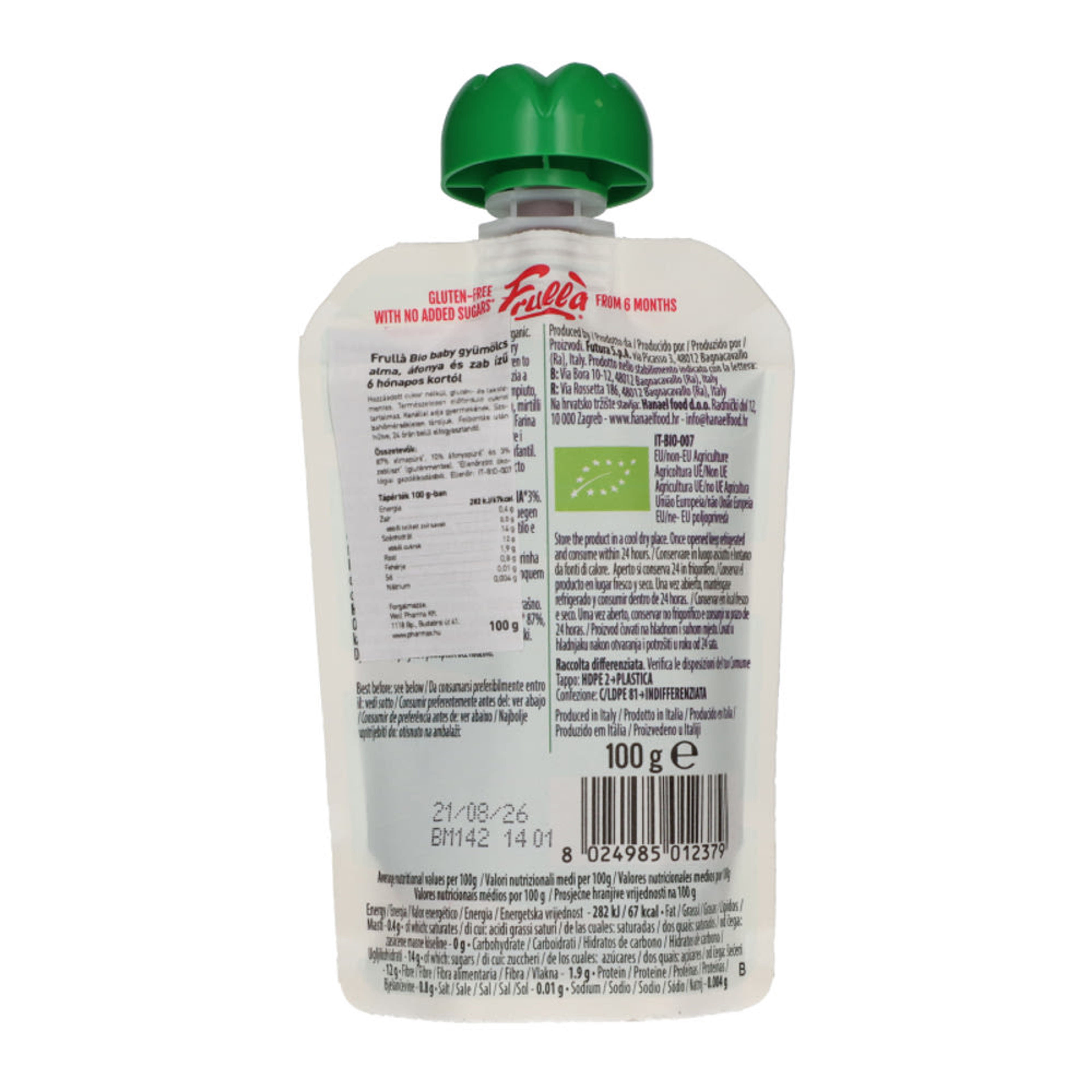 Csak ellenőrzött ökológiai gazdálkodásból származó gyümölcsöt tartalmazó gyümölcspüré, zabliszttel. Hozzáadott cukor nélkül, glutén - és laktózmentes. Természetesen előforduló cukrot tartalmaz. A benne található zabliszt glutén mentes.