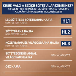 KÖTELEZŐ HASZNÁLATI UTASÍTÁSOK A HAJFESTÉKEK/HAJSZÍNEZŐK SÚLYOS ALLERGIÁS REAKCIÓT VÁLTHATNAK KI. Olvassa el és kövesse az utasításokat! Ezt a terméket nem 16 éven aluli személyeknél való alkalmazásra szánták. AZ IDEIGLENES “FEKETE HENNA” TETOVÁLÁS NÖVELHETI AZ ALLERGIA KIALAKULÁSÁNAK KOCKÁZATÁT. • Ne használjon hajfestéket/hajszínezőt, ha : • Arcán kiütés van, vagy fejbőre érzékeny, irritált vagy sérült. • Hajfestés után bármikor, bármilyen reakciót észlelt. • Korábban, ideiglenes « fekete henna » tetoválás során valamilyen reakciót észlelt. EGY ALLERGIA FIGYELMEN KÍVÜL HAGYÁSA ÉLETVESZÉLYES LEHET. Kötelezően végezzen ALLERGIÁRA FIGYELMEZTETŐ BŐRPRÓBÁT mindenképpen 48 órával a termék minden használata előtt, akkor is, ha már használt előtte bármikor hajfestéket. Ne felejtse el előre megvenni hajfestékét, hogy elvégezhesse az allergiára figyelmeztető bőrpróbát 48 órával a hajfestés előtt. (Olvassa el és kövesse a használati útmutatót.) Bármilyen reakció vagy kétely esetén beszéljen orvossal bármely hajfesték/hajszínező használata előtt. -A színelőhívó a hidrogén-peroxidot tartalmaz. - A hajfesték fenilén-diaminokat, fenilén-diaminokat (toluol-diamint), rezorcint, és ammóniát tartalmaz. - A termék ne kerüljön szembe, ne használja szempilla és szemöldök festésére. - Amennyiben a festék szembe jut, azonnal öblítse ki bő vízzel. -Viselje a dobozban található kesztyűt. - A hajfestés végén alaposan öblítse le a hajat! - Dauerolás, hajkiegyenesítés vagy tartós hajkiegyenestés után várjon legalább 2 hetet a termék használatával. - Ne használja hennával vagy hajszín-regenerálóval festett hajon. - Gyermekektől elzárva tartandó! KÖVESSE A HASZNÁLATI ÚTMUTATÓT! Az összetevők listája a csomagolás alján található.