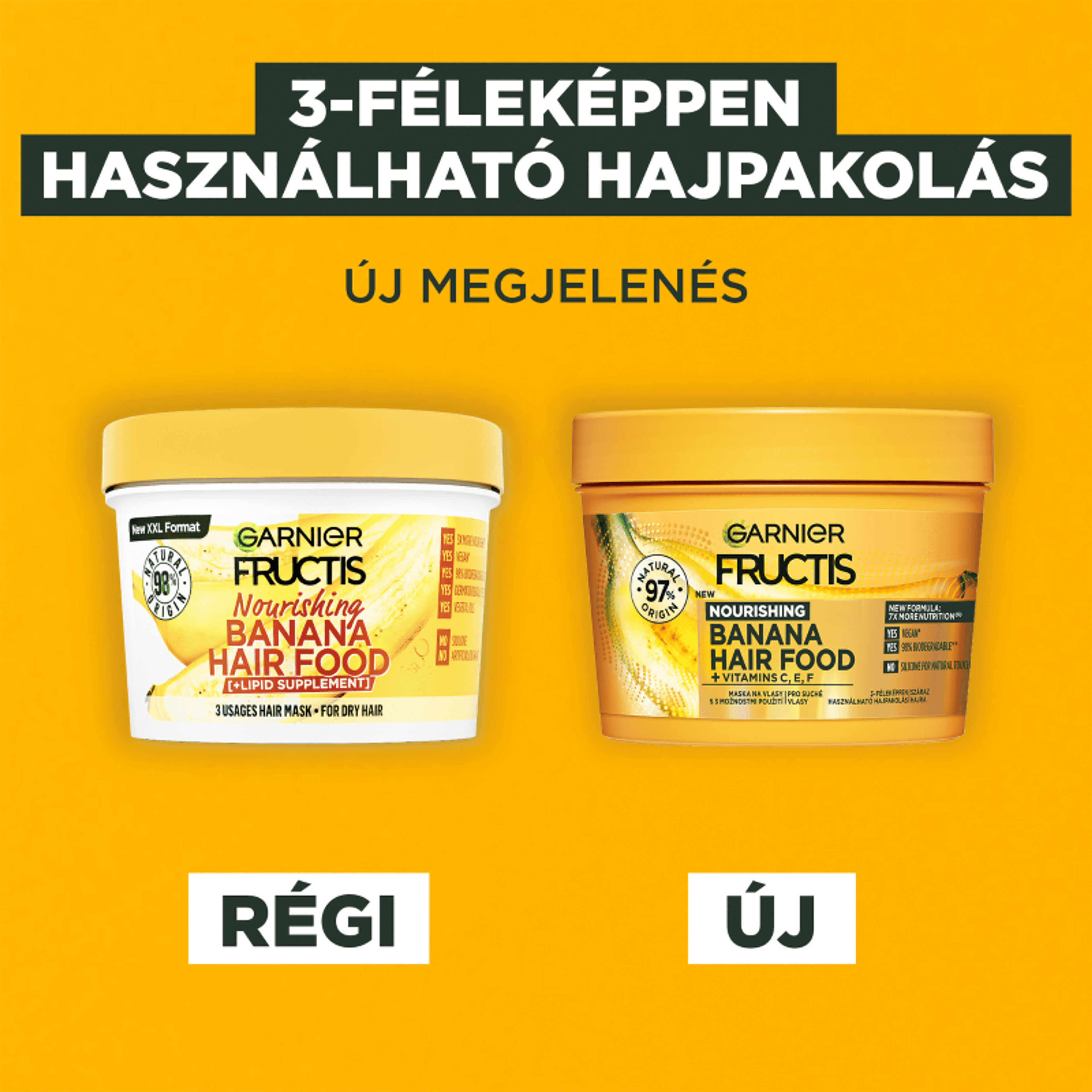 Hajpakolás száraz hajra C-, E- és F-vitaminnal gazdagítva 3-féle használatra. 1. Balzsamként 2. Vagy hajpakolásként 3. Vagy nem kiöblítendő ápolóként Akár 7-szer több táplálás (1). 97%-ban természetes eredetű formula. A fennmaradó 3% garantálja a formula érzékszervi tulajdonságait és eltarthatóságát. (1) Műszeres teszt a hajpakolás felvitele, majd leöblítése után.