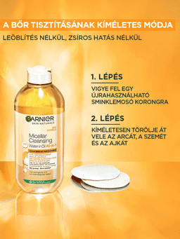 All in one tisztító megoldás továbbfejlesztett és rendkívül hatékony formulával. Egy mozdulattal eltávolítja a hosszan tartó sminket, még a vízállót is, miközben táplálja a bőrt és nem hagy maradékot* a bőrön. *Fogyasztói teszt, 143 önkéntes, 4 hét, 75,5% egyetért
