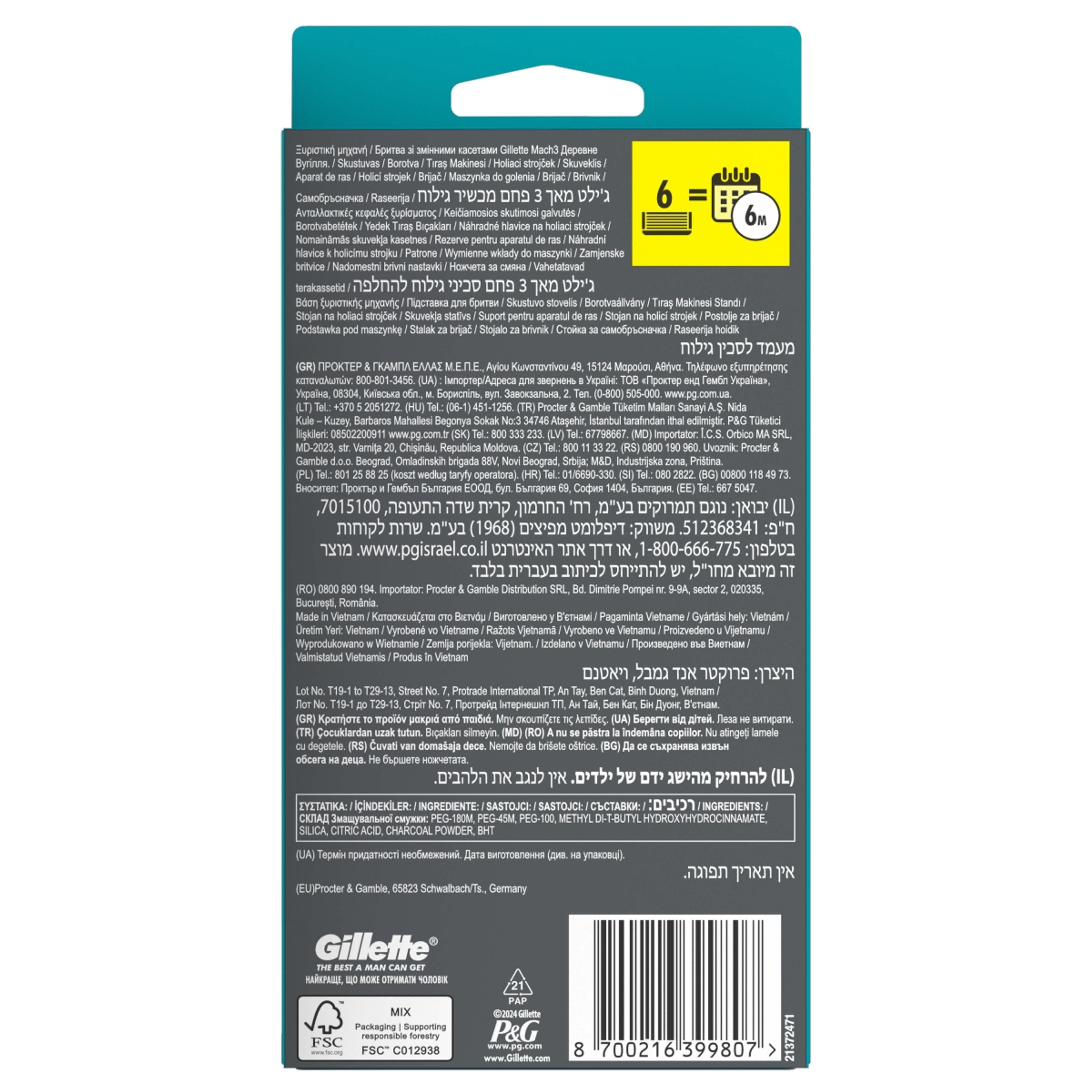 Gillette Mach3 Charcoal férfi borotva készülék 6 db borotvabetéttel - 1 db