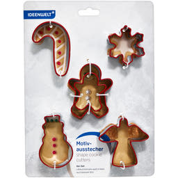 Készíts látványos, ünnepi süteményeket ezzel a 6 darabos IDEENWELT süteményszaggató készlettel! A klasszikus karácsonyi minták – mint a mézeskalácsfigura, a hóember vagy az angyal – garantáltan feldobják a sütés élményét, legyen szó mézeskalácsról, linzerről vagy más aprósüteményről. A formák rozsdamentes acélból készültek, ami biztosítja a tartósságot és a könnyű tisztíthatóságot. A piros perem nemcsak látványos, hanem praktikus is: kényelmes fogást biztosít használat közben.