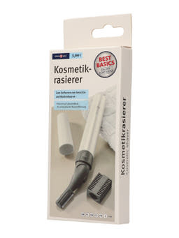 Kozmetikai borotva, borotvafej hajlítható, kétoldalú fésufeltéttel együtt a különbözo hosszúságokhoz, a bikinizónára is alkalmas