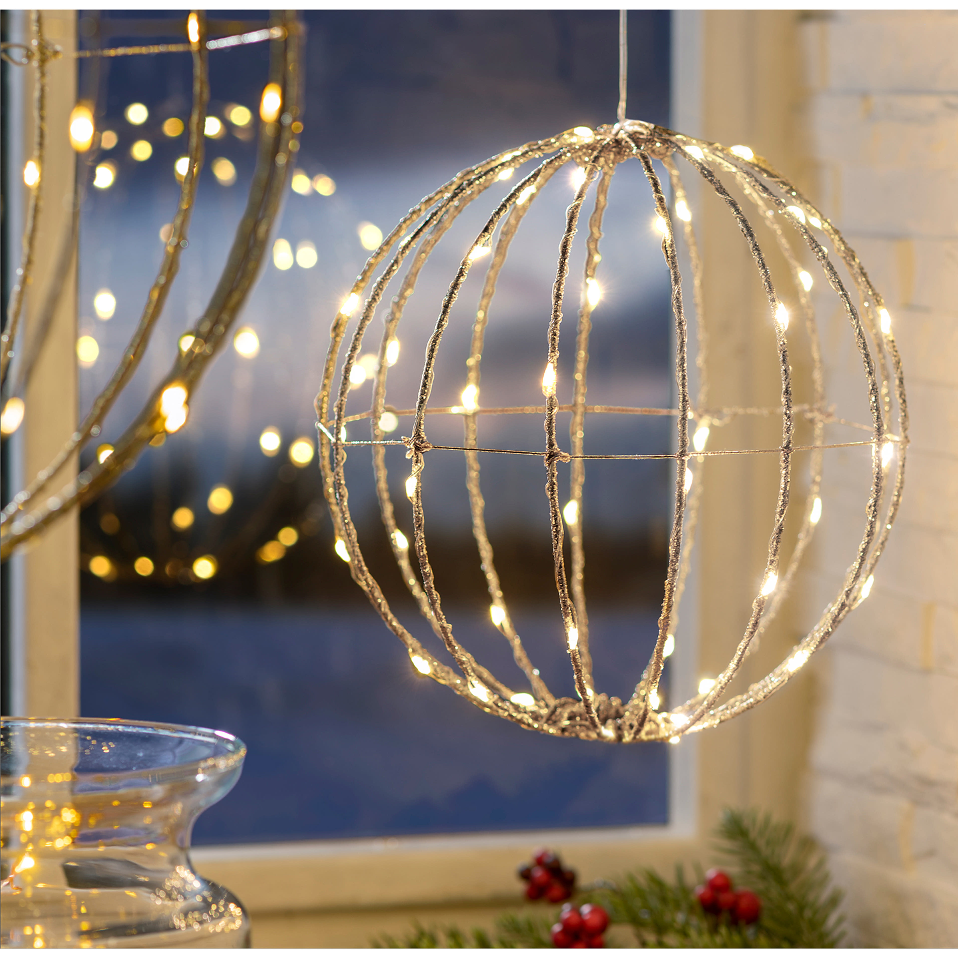 Varázslatos hangulatvilágítást teremthetsz ezzel a melegfehér fényű LED drótgömbbel, amely 50 ragyogó LED-et rejt stílusos, légiességet sugárzó gömbformában. A kb. 20 cm átmérőjű, könnyedén összehajtható dekoráció ideális ablakba, polcra, asztalra vagy ünnepi dekorációként.