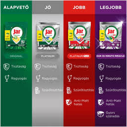 KIMAGASLÓ TISZTÍTÓERŐ MÉG RÖVID PROGRAMOK ESETÉN IS. Fedezze fel a Jar Platinum Plus All in One mosogatókapszulát, amely ideális megoldás, ha előmosogatás nélkül szeretne elérni makulátlanul tiszta edényeket. A Jar folyékony mosogatószerhez hasonlóan megbirkózik a makacs szennyeződésekkel, egy hatékony, a mosogatógéphez tervezett kapszula formájában A megfakulás elleni technológiának köszönhetően a Jar Platinum Plus megszünteti a fakóságot, és helyreállítja az edények eredeti ragyogását. A Jar Platinum Plus rendkívül jól oldódó kapszulája gyorsan feloldódik, és a hatékony tisztítás érdekében azonnal kifejti intenzív hatását. A mosogatókapszula a folyékony és a por állagú mosogatószerek erejét ötvözi magában, így páratlan tisztítóhatást és kényelmes használatot tesz lehetővé. Felveszi a küzdelmet a makacs, zsíros szennyeződésekkel szemben, még rövid programok esetén is (< 55 perces, előre beprogramozott mosogatási ciklus esetén is). Tapasztalja meg a ragyogó edényeket, a fakulás elleni technológiát és a mosogatógépet frissen tartó tiszta szűrőt. A mosogatókapszulák használata rendkívül egyszerű – ráadásul vízlágyító sót és öblítőt is tartalmaznak. Ne nyúljon hozzá nedves kézzel. Minden egyes használatot követően zárja le újra a tasakot.