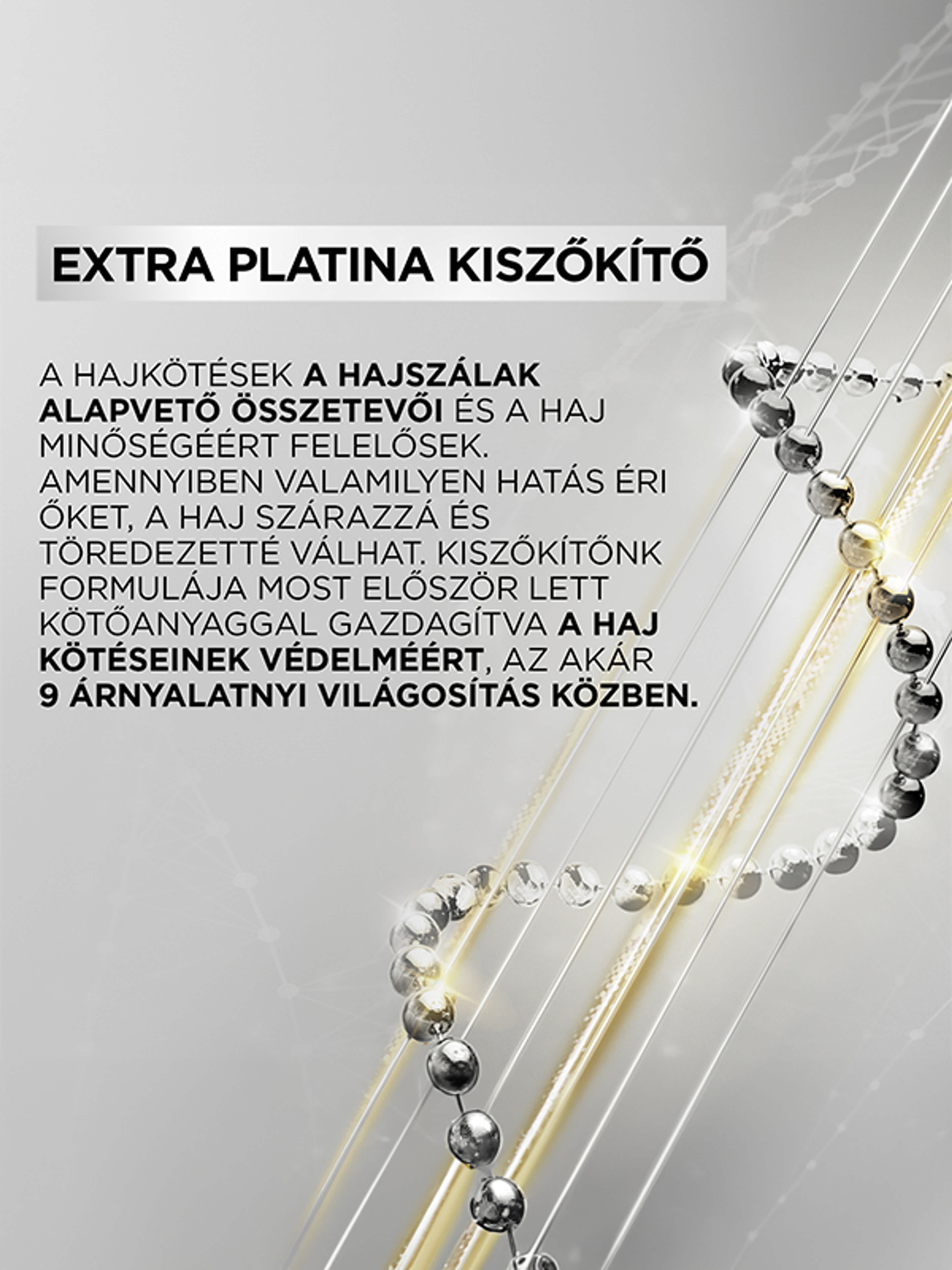 Színtiszta és ragyogó platinaszőke hajszín heteken át. Hi-shine komplex-szel gazdagított sárgás-rezes színt gátló hajápoló, a hajszín ragyogásáért.