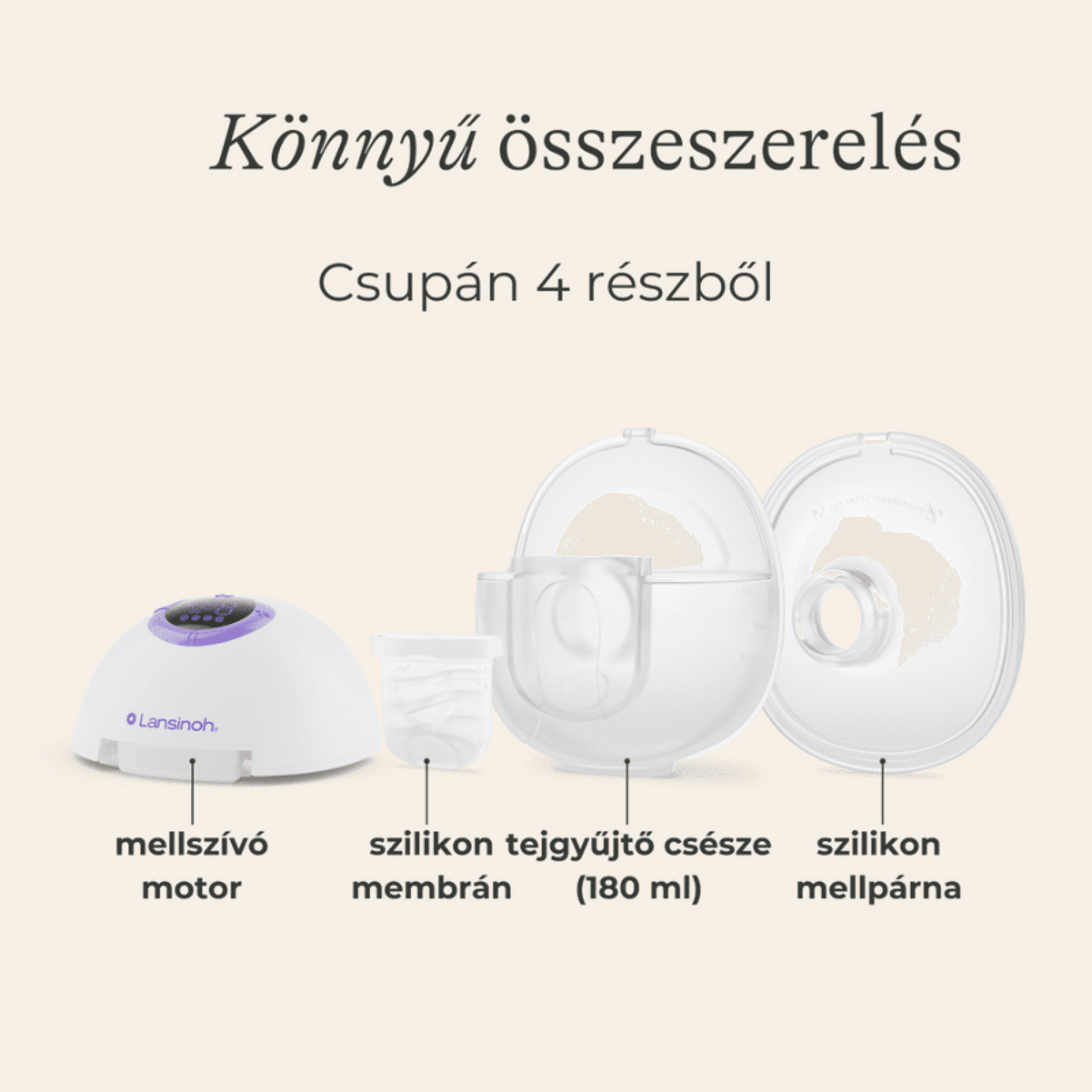 A Lansinoh hordható mellszívó mindent tartalmaz, amire szükséged van a kéz nélküli fejéshez, beleértve (lásd: Használati útmutató):