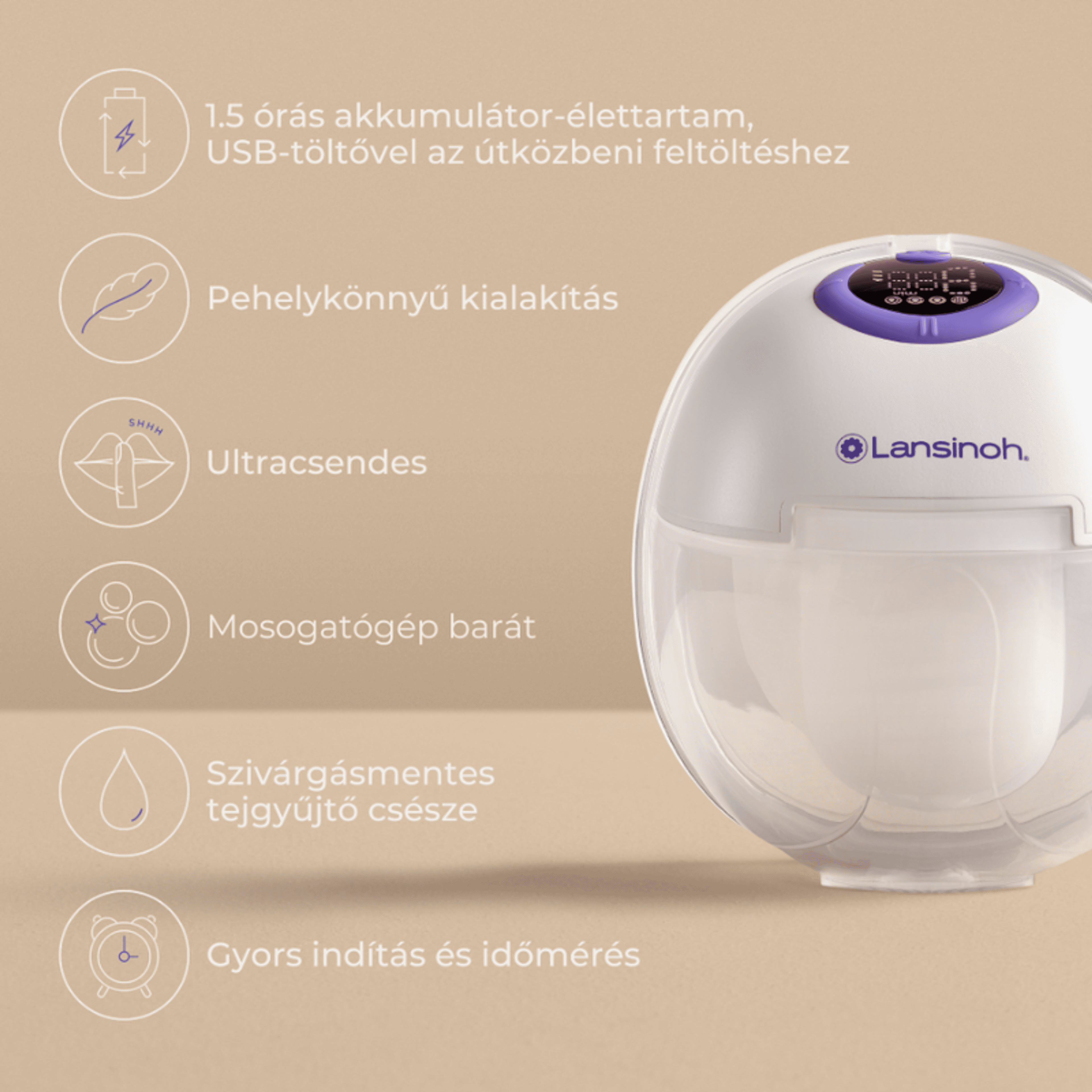 A Lansinoh hordható mellszívója teljesen kéz nélküli használatot biztosít. Diszkréten illeszkedik a melltartódba csövek és vezetékek nélkül, lehetővé téve a fejést kompromisszumok nélkül. Szupercsendes és könnyű, 1,5 órás akkumulátor-üzemidővel a tényleges kéz nélküli fejéshez. Csupán 4 mosogatógépben tisztítható alkatrésze van, ezzel az idő is a „Te oldaladon áll”.