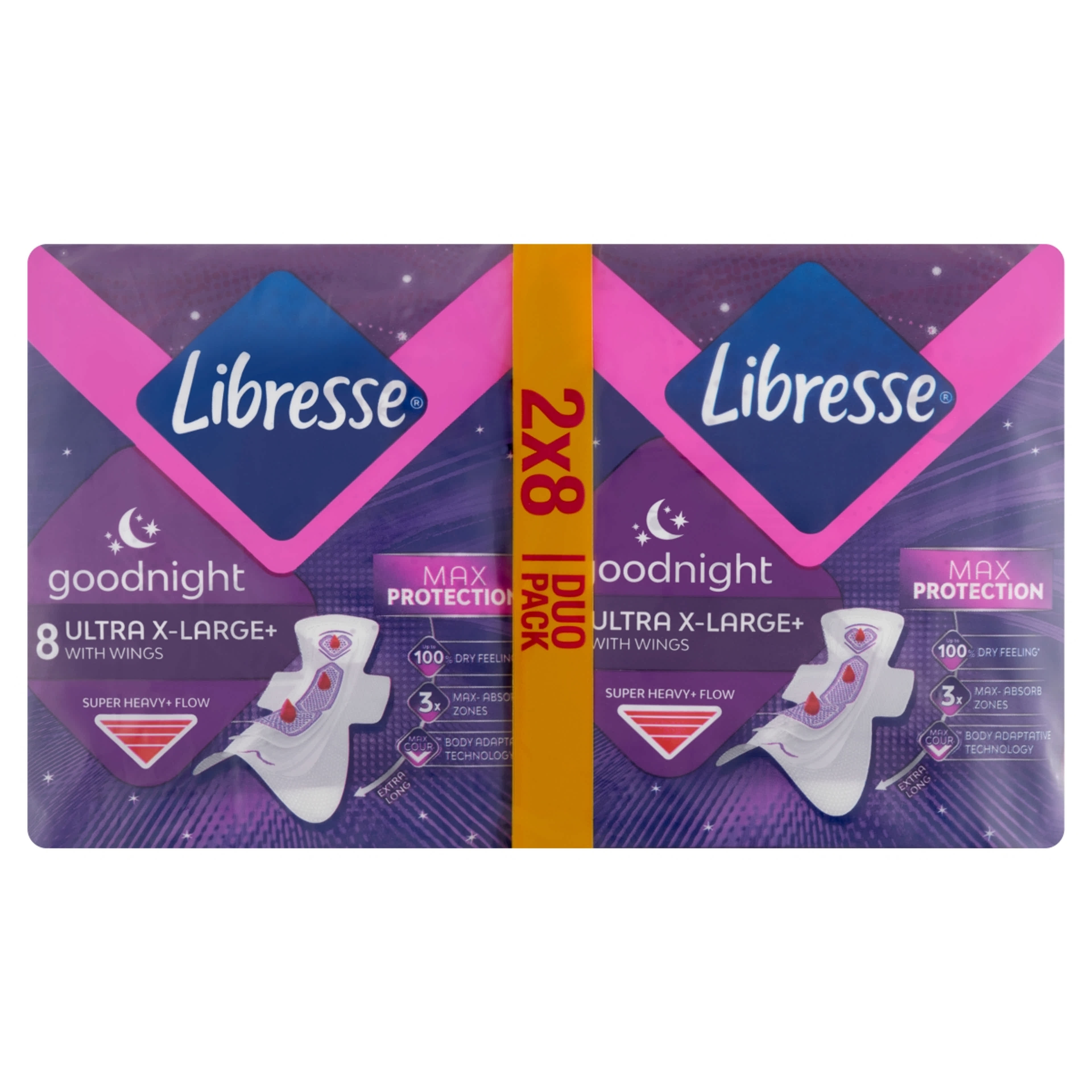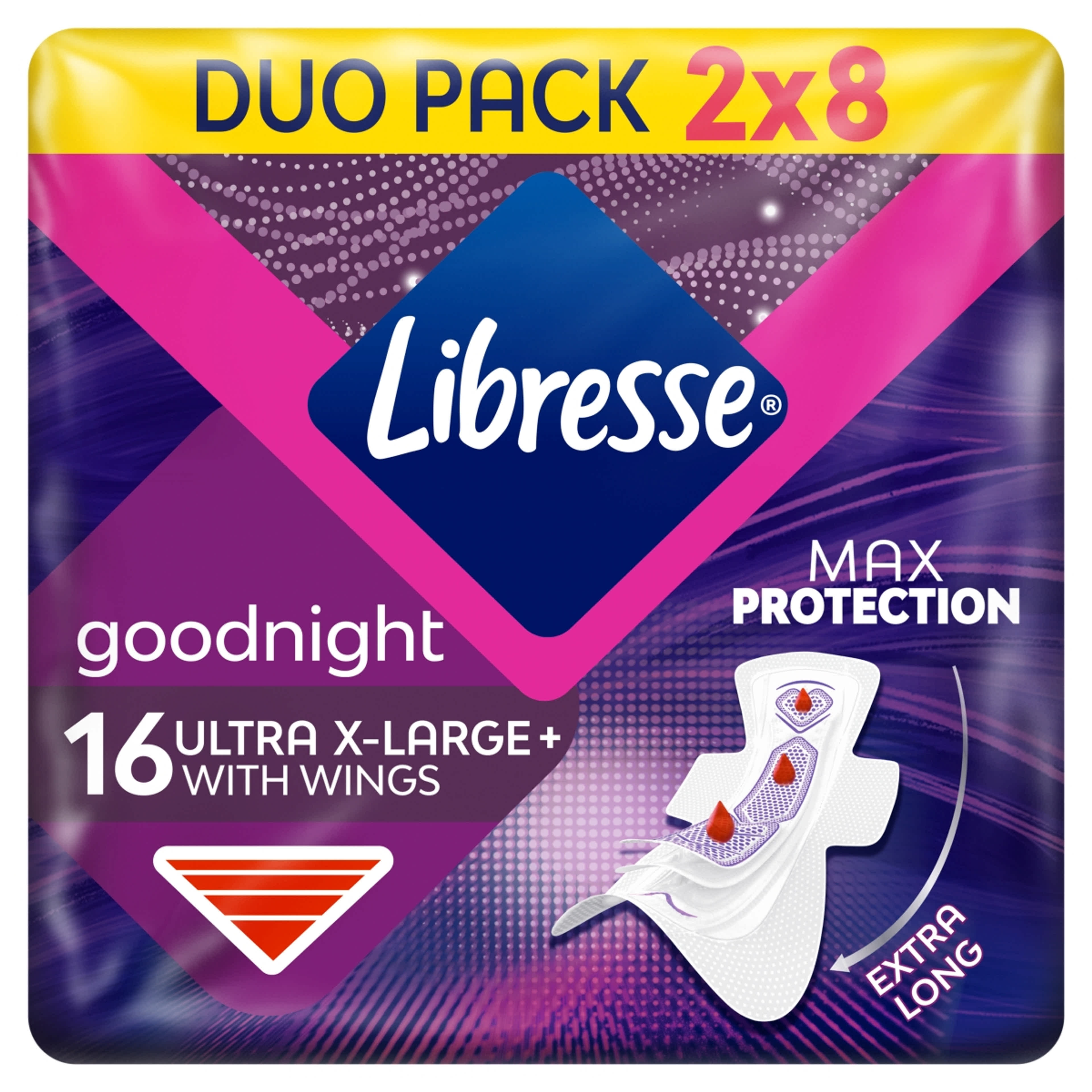 Egész éjjel nyugodtan pihenhetsz, hála a megbízható védelemnek. A Libresse Goodnight Ultra X-Large+ menstruációs betétek maximális védelmet nyújtanak, amely még a legerősebb éjszakai vérzés esetén is hatékony.