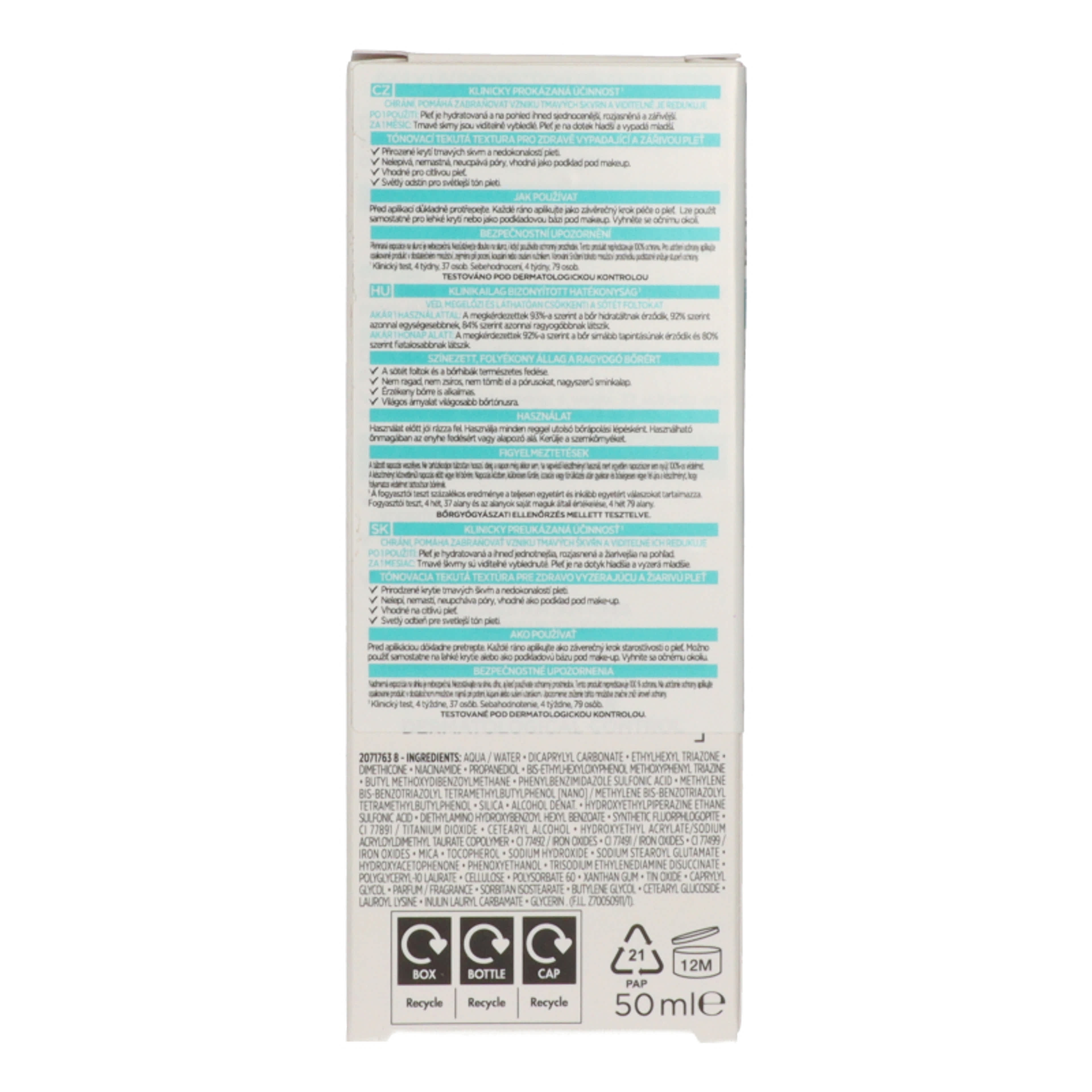 A ragyogást adó, színezett fluid SPF50+ fényvédővel sötét foltok ellen nagyon magas, széles spektrumú védelmet nyújt az UVB- és az UVA- sugarak ellen, miközben segít megelőzni a sötét foltokat és a bőröregedés látható jeleit is. Könnyű fedés az egyenletes bőrtónusért és a bőr ragyogásáért. UV-szűrők: SPF 50+ nagyon magas, széles spektrumú védelem az UVB- és az UVA- sugarak ellen. Segítenek megelőzni a sötét foltokat és a bőröregedés látható jeleit. Niacinamid: ragyogást adó összetevő, amely segít csökkenteni a sötét foltok megjelenését. Tonizáló pigment: könnyű fedés az egyenletes bőrtónusért és a bőr ragyogásáért.