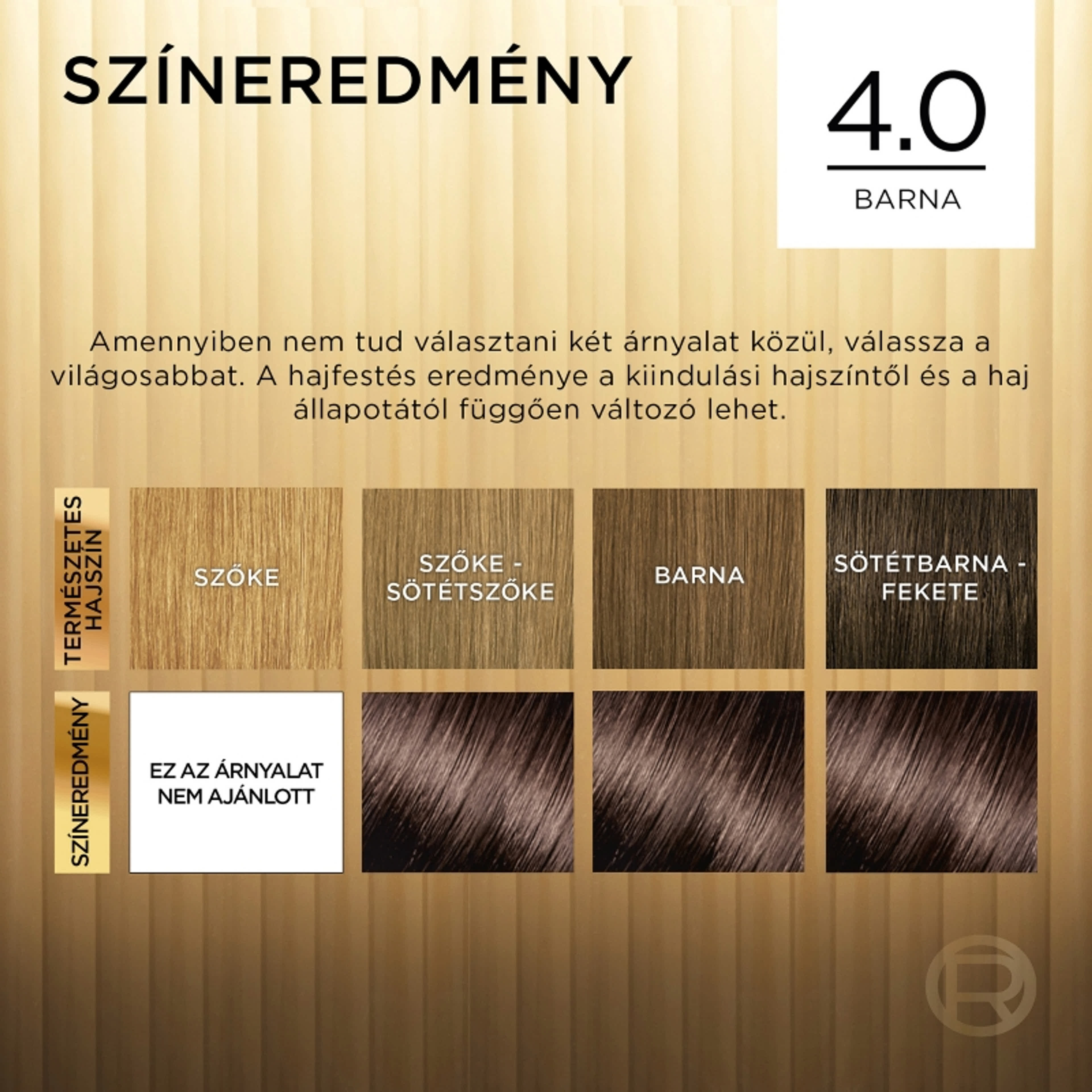 KÖTELEZŐ HASZNÁLATI UTASÍTÁSOK A HAJFESTÉKEK/HAJSZÍNEZŐK SÚLYOS ALLERGIÁS REAKCIÓT VÁLTHATNAK KI. Olvassa el és kövesse az utasításokat! Ezt a terméket nem 16 éven aluli személyeknél való alkalmazásra szánták. AZ IDEIGLENES “FEKETE HENNA” TETOVÁLÁS NÖVELHETI AZ ALLERGIA KIALAKULÁSÁNAK KOCKÁZATÁT. • Ne használjon hajfestéket/hajszínezőt, ha : • Arcán kiütés van, vagy fejbőre érzékeny, irritált vagy sérült. • Hajfestés után bármikor, bármilyen reakciót észlelt. • Korábban, ideiglenes « fekete henna » tetoválás során valamilyen reakciót észlelt. EGY ALLERGIA FIGYELMEN KÍVÜL HAGYÁSA ÉLETVESZÉLYES LEHET. Kötelezően végezzen ALLERGIÁRA FIGYELMEZTETŐ BŐRPRÓBÁT mindenképpen 48 órával a termék minden használata előtt, akkor is, ha már használt előtte bármikor hajfestéket. Ne felejtse el előre megvenni hajfestékét, hogy elvégezhesse az allergiára figyelmeztető bőrpróbát 48 órával a hajfestés előtt. (Olvassa el és kövesse a használati útmutatót.) Bármilyen reakció vagy kétely esetén beszéljen orvossal bármely hajfesték/hajszínező használata előtt. -A színelőhívó a hidrogén-peroxidot tartalmaz. - A hajfesték fenilén-diaminokat, fenilén-diaminokat (toluol-diamint), rezorcint, és ammóniát tartalmaz. - A termék ne kerüljön szembe, ne használja szempilla és szemöldök festésére. - Amennyiben a festék szembe jut, azonnal öblítse ki bő vízzel. -Viselje a dobozban található kesztyűt. - A hajfestés végén alaposan öblítse le a hajat! - Dauerolás, hajkiegyenesítés vagy tartós hajkiegyenestés után várjon legalább 2 hetet a termék használatával. - Ne használja hennával vagy hajszín-regenerálóval festett hajon. - Gyermekektől elzárva tartandó! KÖVESSE A HASZNÁLATI ÚTMUTATÓT! Az összetevők listája a csomagolás alján található.