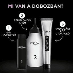 KÖTELEZŐ HASZNÁLATI UTASÍTÁSOK A HAJFESTÉKEK/HAJSZÍNEZŐK SÚLYOS ALLERGIÁS REAKCIÓT VÁLTHATNAK KI. Olvassa el és kövesse az utasításokat! Ezt a terméket nem 16 éven aluli személyeknél való alkalmazásra szánták. AZ IDEIGLENES “FEKETE HENNA” TETOVÁLÁS NÖVELHETI AZ ALLERGIA KIALAKULÁSÁNAK KOCKÁZATÁT. • Ne használjon hajfestéket/hajszínezőt, ha : • Arcán kiütés van, vagy fejbőre érzékeny, irritált vagy sérült. • Hajfestés után bármikor, bármilyen reakciót észlelt. • Korábban, ideiglenes « fekete henna » tetoválás során valamilyen reakciót észlelt. EGY ALLERGIA FIGYELMEN KÍVÜL HAGYÁSA ÉLETVESZÉLYES LEHET. Kötelezően végezzen ALLERGIÁRA FIGYELMEZTETŐ BŐRPRÓBÁT mindenképpen 48 órával a termék minden használata előtt, akkor is, ha már használt előtte bármikor hajfestéket. Ne felejtse el előre megvenni hajfestékét, hogy elvégezhesse az allergiára figyelmeztető bőrpróbát 48 órával a hajfestés előtt. (Olvassa el és kövesse a használati útmutatót.) Bármilyen reakció vagy kétely esetén beszéljen orvossal bármely hajfesték/hajszínező használata előtt. -A színelőhívó a hidrogén-peroxidot tartalmaz. - A hajfesték fenilén-diaminokat, fenilén-diaminokat (toluol-diamint), rezorcint, és ammóniát tartalmaz. - A termék ne kerüljön szembe, ne használja szempilla és szemöldök festésére. - Amennyiben a festék szembe jut, azonnal öblítse ki bő vízzel. -Viselje a dobozban található kesztyűt. - A hajfestés végén alaposan öblítse le a hajat! - Dauerolás, hajkiegyenesítés vagy tartós hajkiegyenestés után várjon legalább 2 hetet a termék használatával. - Ne használja hennával vagy hajszín-regenerálóval festett hajon. - Gyermekektől elzárva tartandó! KÖVESSE A HASZNÁLATI ÚTMUTATÓT! Az összetevők listája a csomagolás alján található.