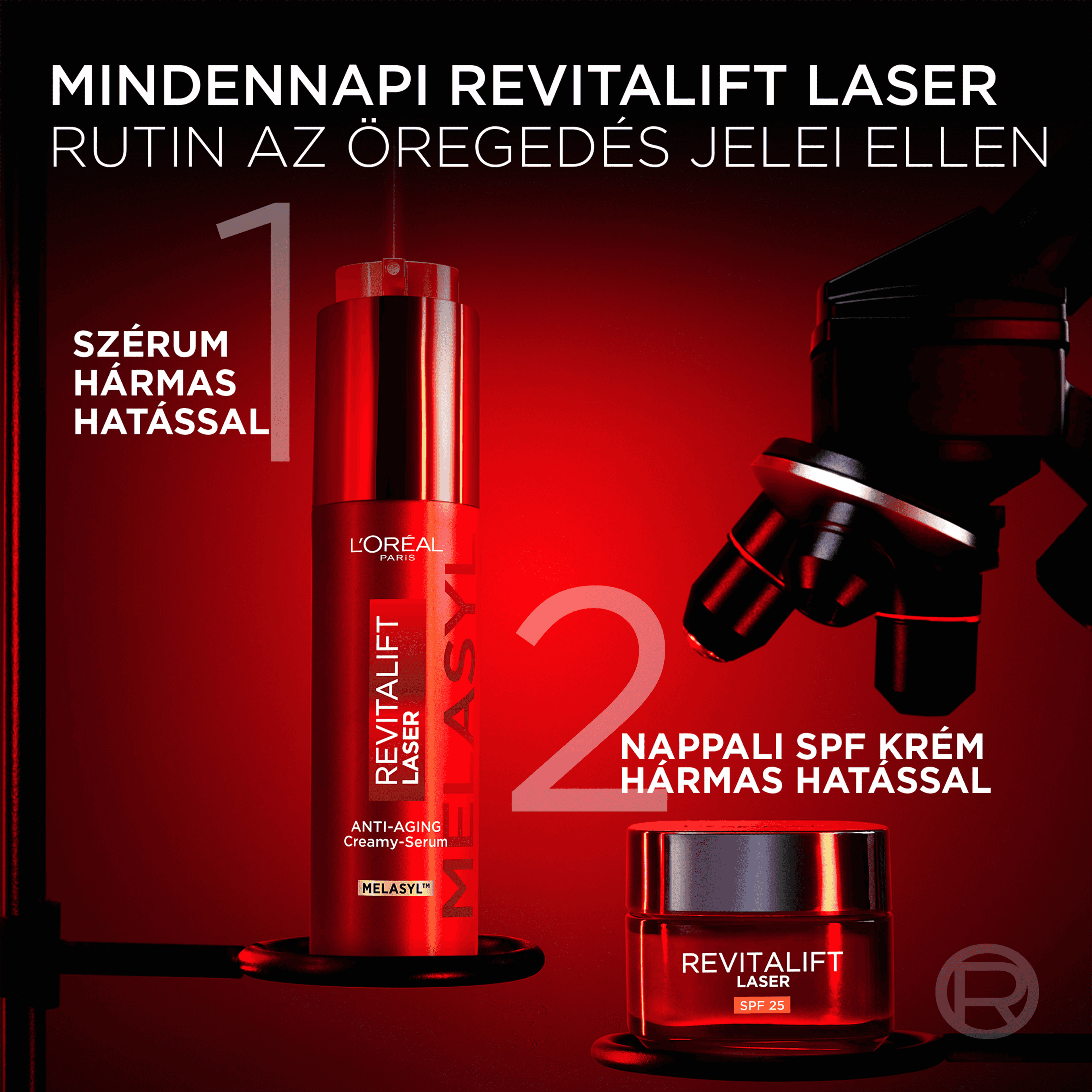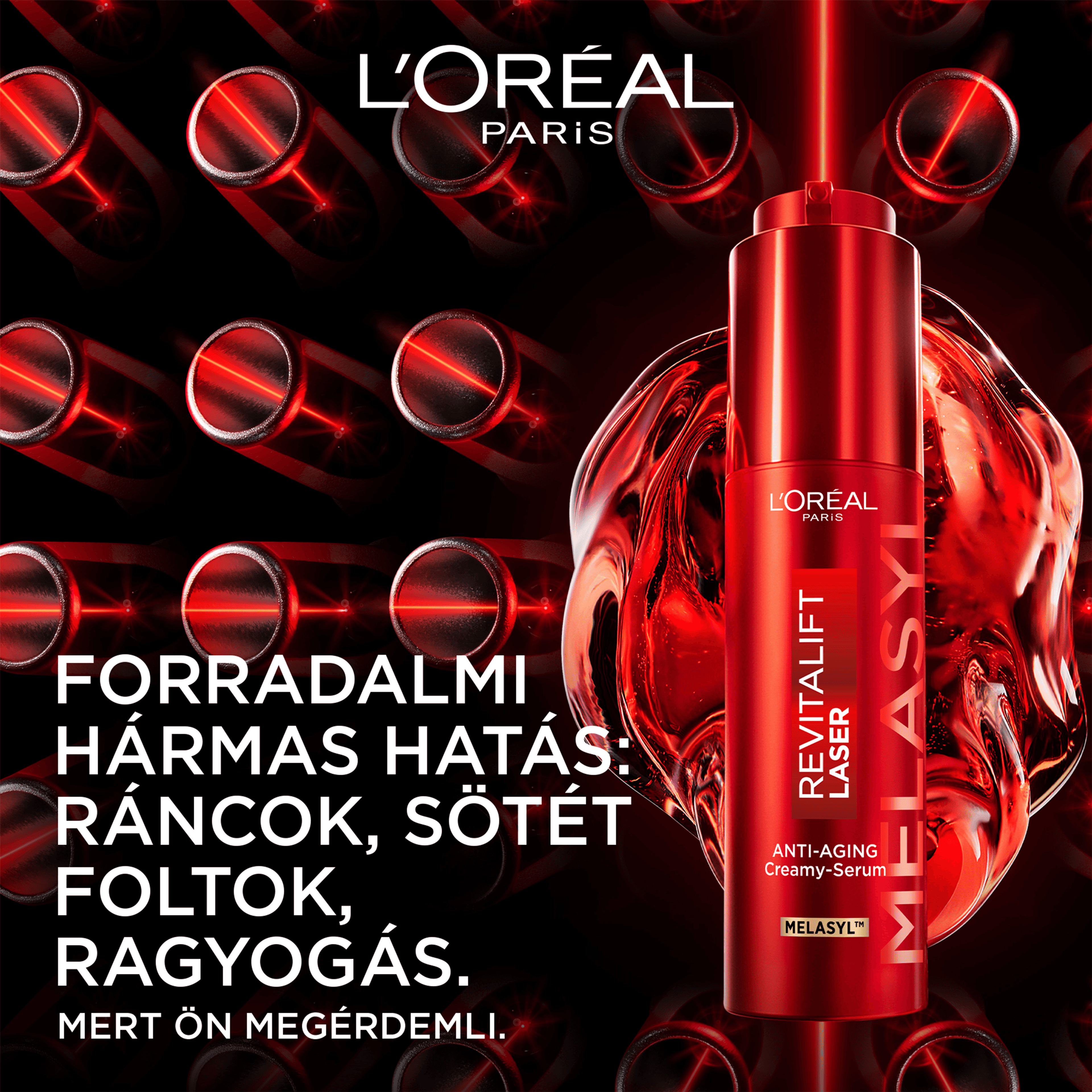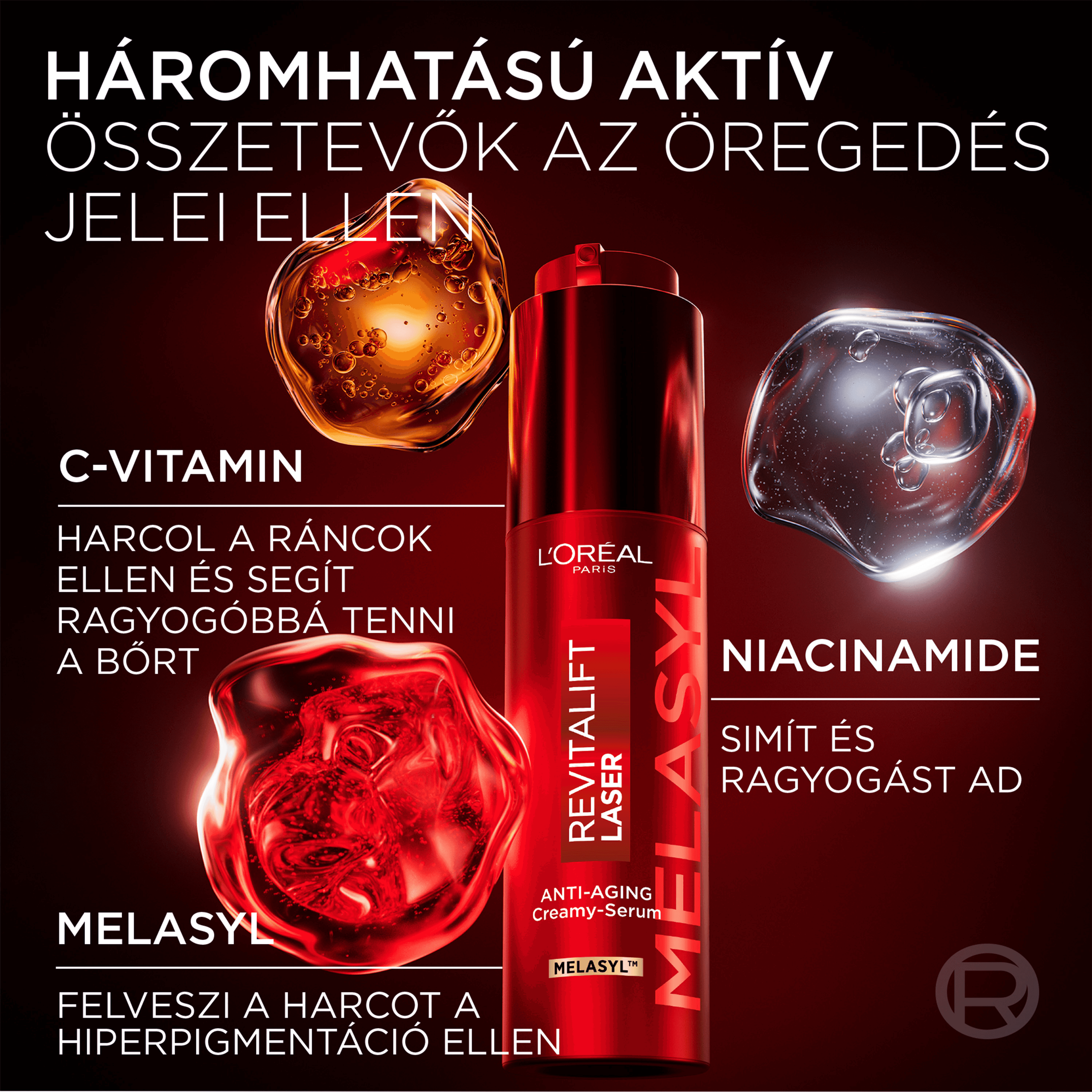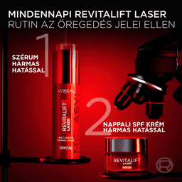 A L'Oréal Paris Revitalift Laser regeneráló krémes szérum a szabadalmaztatott Melasyl™ hatóanyaggal hatékonyan finomítja a ráncokat, csökkenti a sötét foltokat és ragyogóbbá teszi a bőrt. Háromszoros hatású összetétele Melasyl™-t tartalmaz – különleges, átütő innováció és leghatékonyabb hatóanyagunk a hiperpigmentáció és a sötét foltok ellen. Megköti a többlet melanint még mielőtt az megfogná a bőrt, a bizonyítottan gyors és hatékony hatásért. C-vitamint* is tartalmaz, erős antioxidáns hatóanyagot, amely segít ragyogóbbá tenni a bőrt és kisimítani a finom ráncokat. A niacinamid hatékony ragyogást adó hatóanyag, amely segít csökkenteni a sötét foltok és az apróbb ráncok megjelenését, és kíméletesen simítja a bőrfelszínt. C-vitamin-származék