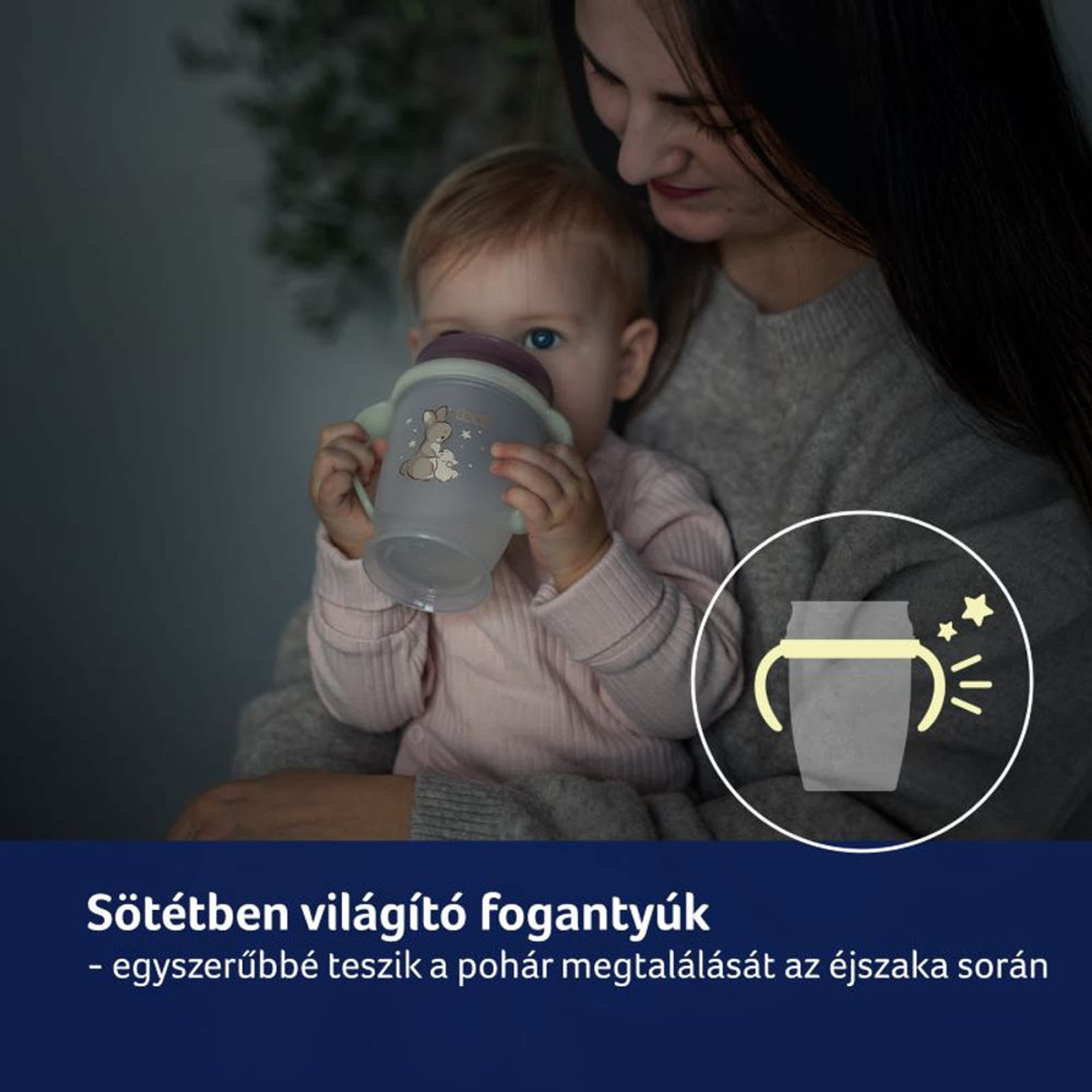 LOVI 360°-os itatópohár: Tanulj meg inni, mint a felnőttek. A 360° NIGHT&DAY pohár ideális olyan gyermekek számára, akik készen állnak arra, hogy önállóan igyanak. Innovatív tömítése lehetővé teszi a folyadék szívását bárhonnan a pohár szélén. Megtanítja a gyermeket az ivómozdulatok irányítására, és felkészíti a nyitott pohárból való ivásra. A pohár szívószája antibakteriális védelemmel rendelkezik a Saniconcentrate™ speciális adalékának köszönhetően, amely akár 99,99%-kal csökkenti a baktériumokat*. Az ergonomikus fogantyúk úgy lettek kialakítva, hogy könnyen illeszkedjenek a kis gyermekkezekhez, ráadásul sötétben világítanak, megkönnyítve a pohár éjjeli megtalálását.