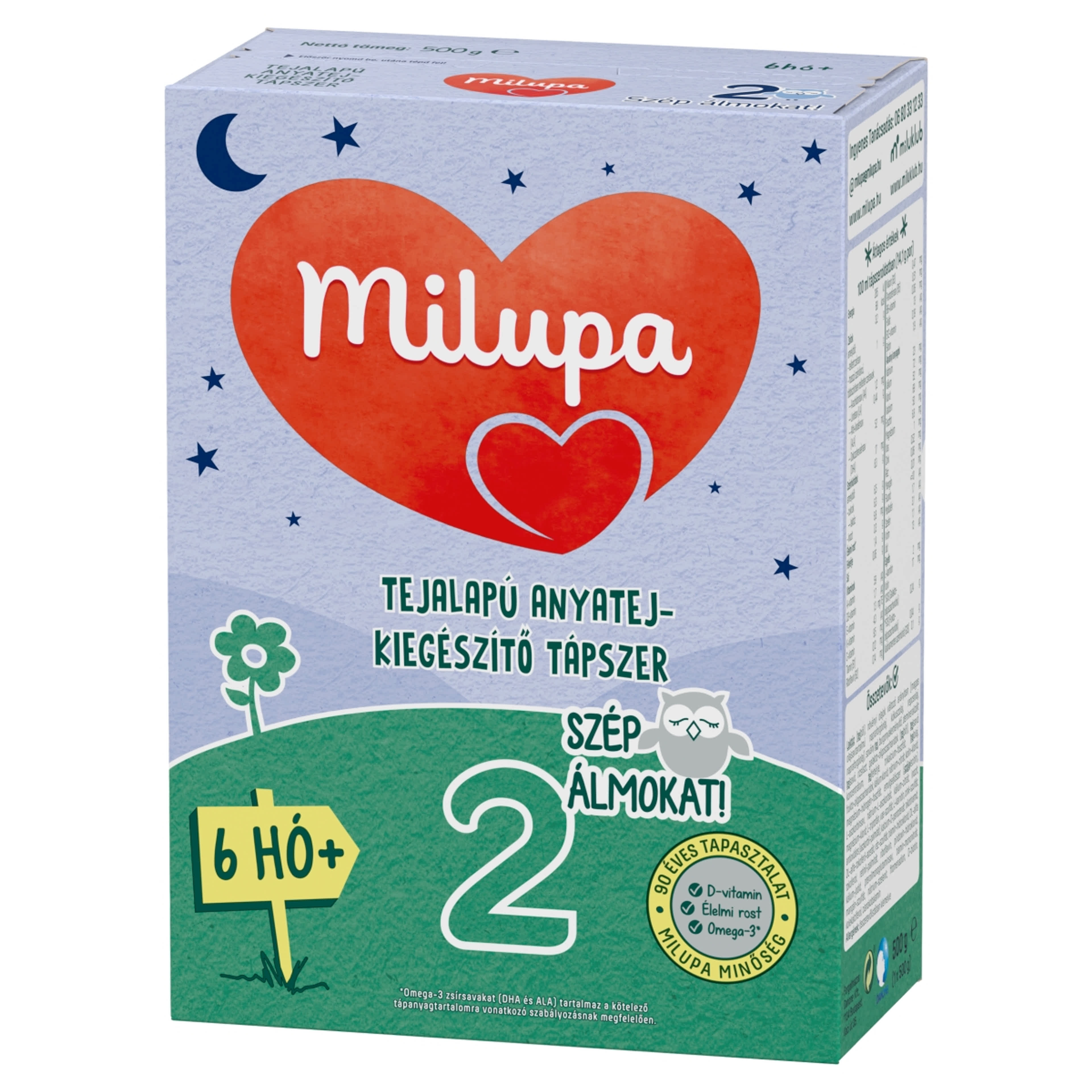 Szakmai ajánlások 6 hónapos korig tartó kizárólagos anyatejes táplálást javasolnak. Bár kisbabád 6 hónapos korában elkezdődik a hozzátáplálás, egyéves koráig még az anyatej adja étrendjének jelentős részét. Amennyiben kisbabád táplálását bármilyen okból tápszerrel folytatod, előtte mindenképp konzultálj gyermekorvosoddal. A Milupa tejalapú anyatej-kiegészítő tápszereivel továbbra is biztosíthatod számára a napi 5-8 dl táplálékot, ami az egészséges növekedéshez és fejlődéshez szükséges. Keményítő- és rizsliszttartalmának köszönhetően a Milupa Szép álmokat! tápszer a hagyományos tápszerekhez képest sűrűbb állagú.