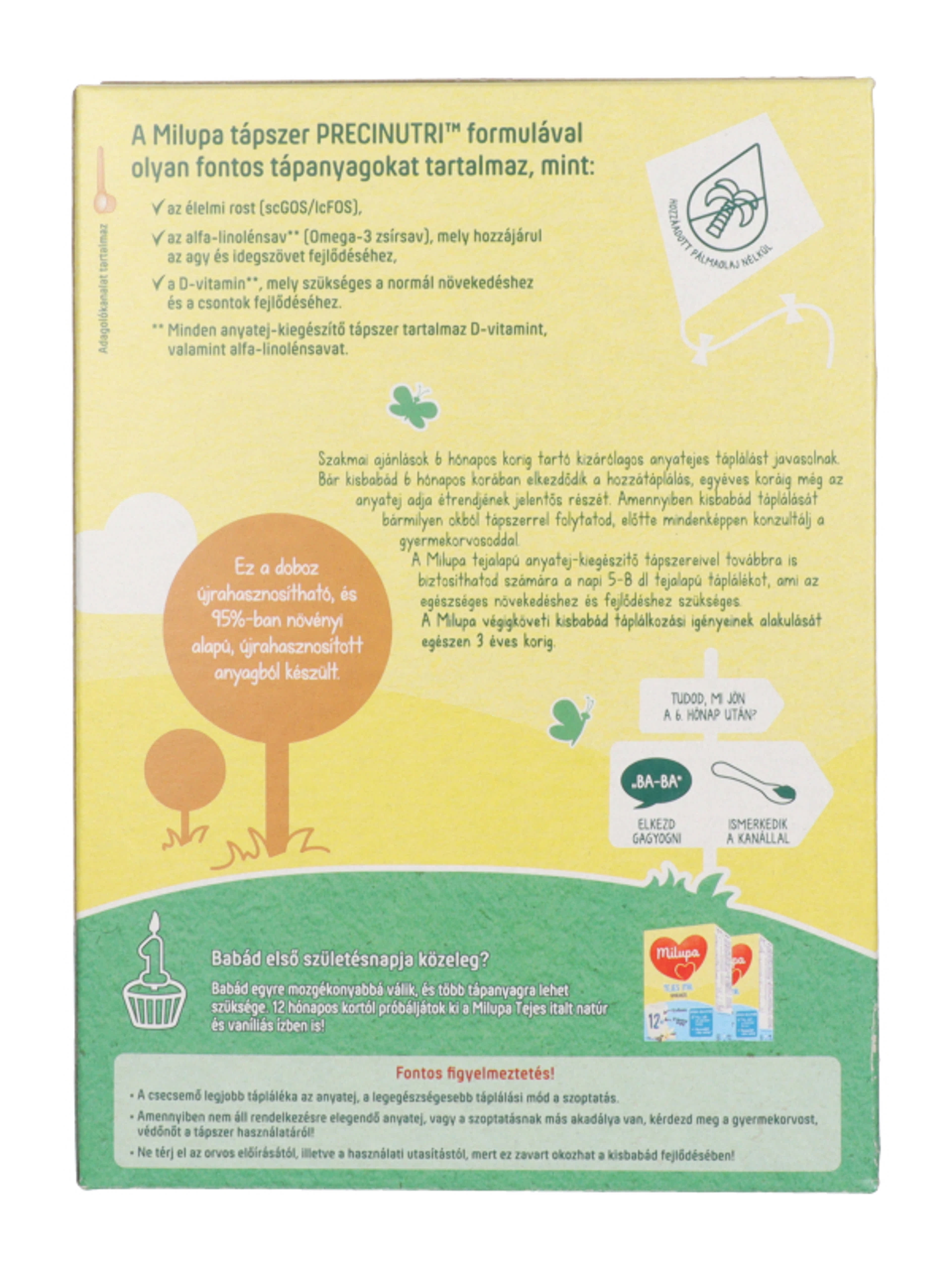 Szakmai ajánlások 6 hónapos korig tartó kizárólagos anyatejes táplálást javasolnak. Bár kisbabád 6 hónapos korában elkezdődik a hozzátáplálás, egyéves koráig még az anyatej adja étrendjének jelentős részét. Amennyiben kisbabád táplálását bármilyen okból tápszerrel folytatod, konzultálj gyermekorvosoddal a gyermeked táplálásával kapcsolatban. A Milupa tejalapú anyatej-kiegészítő tápszereivel továbbra is biztosíthatod számára a napi 5-8 dl tejalapú táplálékot, ami az egészséges növekedéshez és fejlődéshez szükséges.