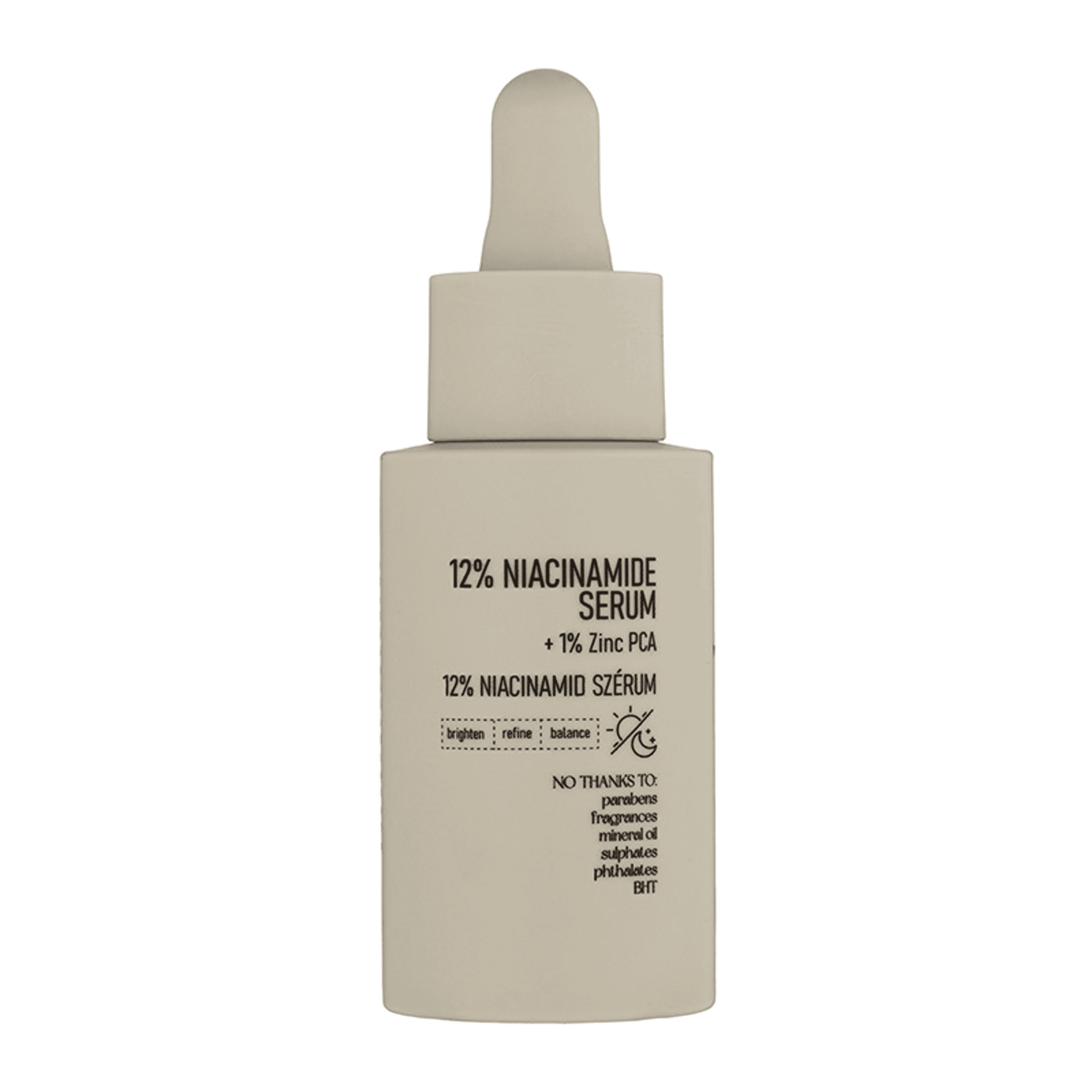 Extra magas, 12% Niacinamidot tartalmazó szérum, 1% Cink PCA-val és Allantoinnal gazdagítva, a túlzott faggyútermelés, a tág pórusok, az egyenetlen textúra és a bőröregedés jeleinek kezelésére. Ez a hatékony formula segít, hogy a bőröd újra egységes és simább legyen. A Niacinamide, egy B3-vitamin, dolgozik a faggyútermelés szabályozásán és a bőrbarrier funkciójának javításán, míg a Cink PCA szintén segít kiegyensúlyozni a zsírosodást, valamint minimalizálni a pórusok megjelenését. Allantoin tartalmával segít nyugtatni a bőrt. Minden bőrtípusra alkalmas. Könnyű, olajmentes, folyékony formula, 100%-ban illatmentes, alkohol-mentes.