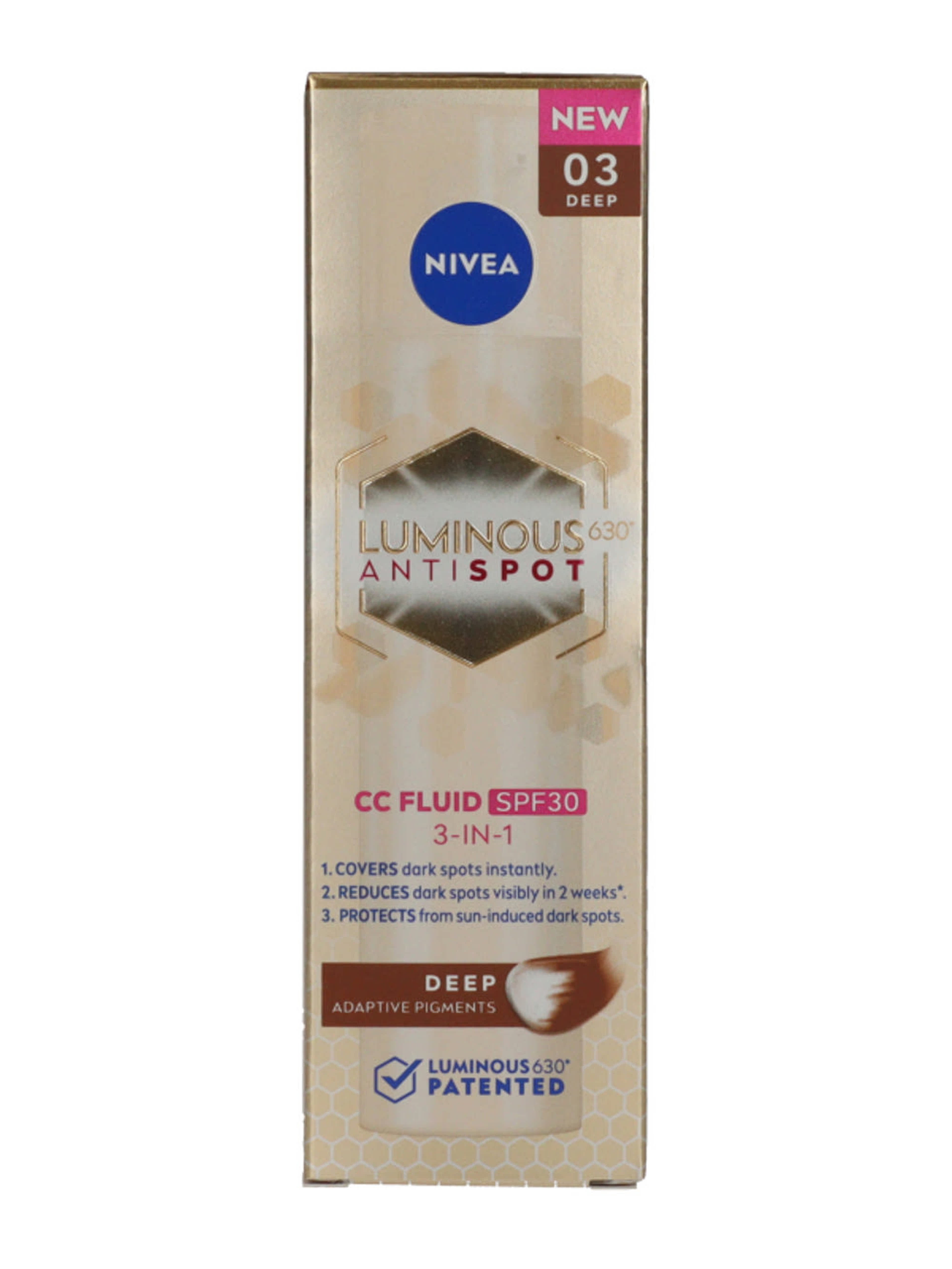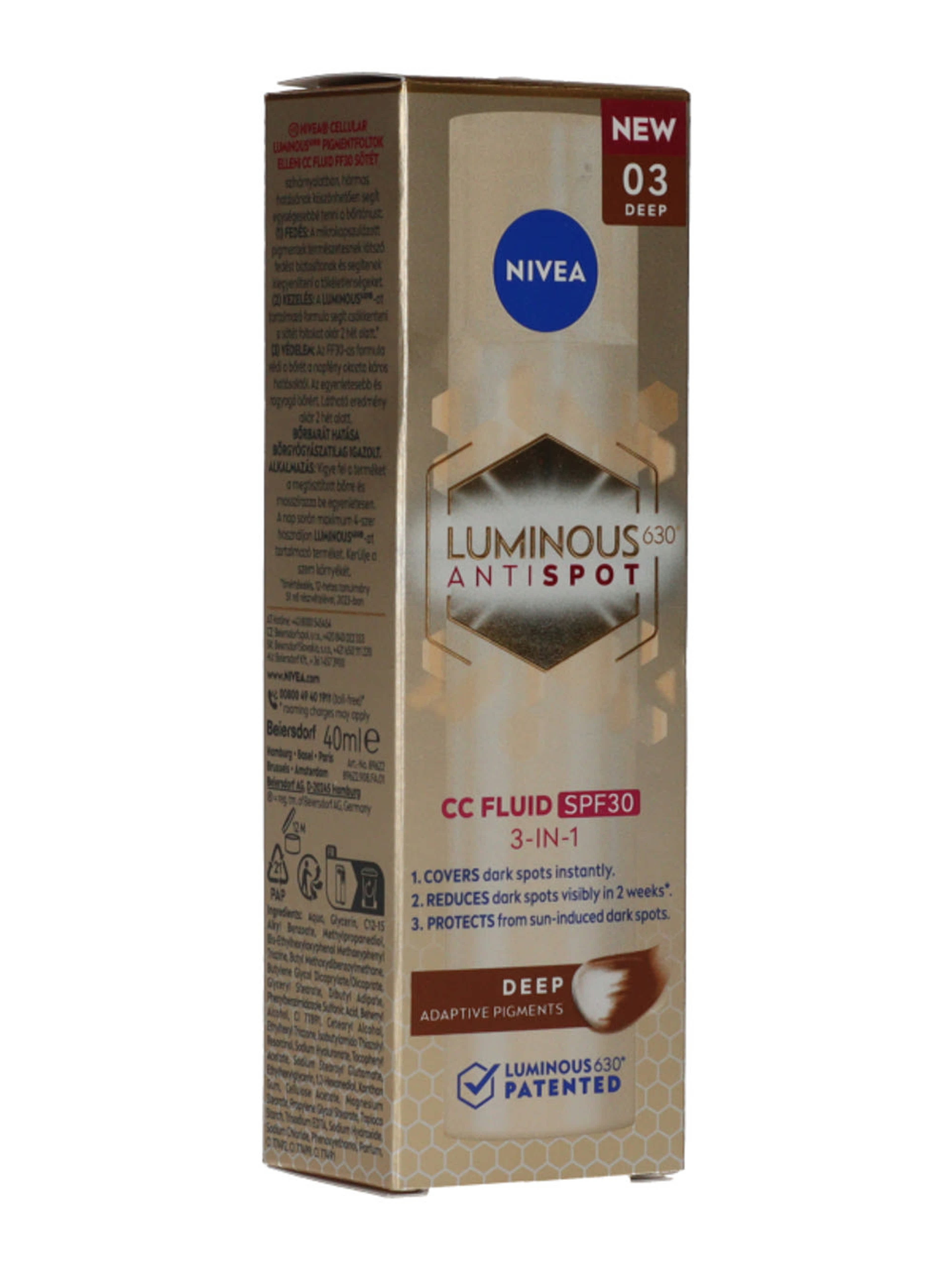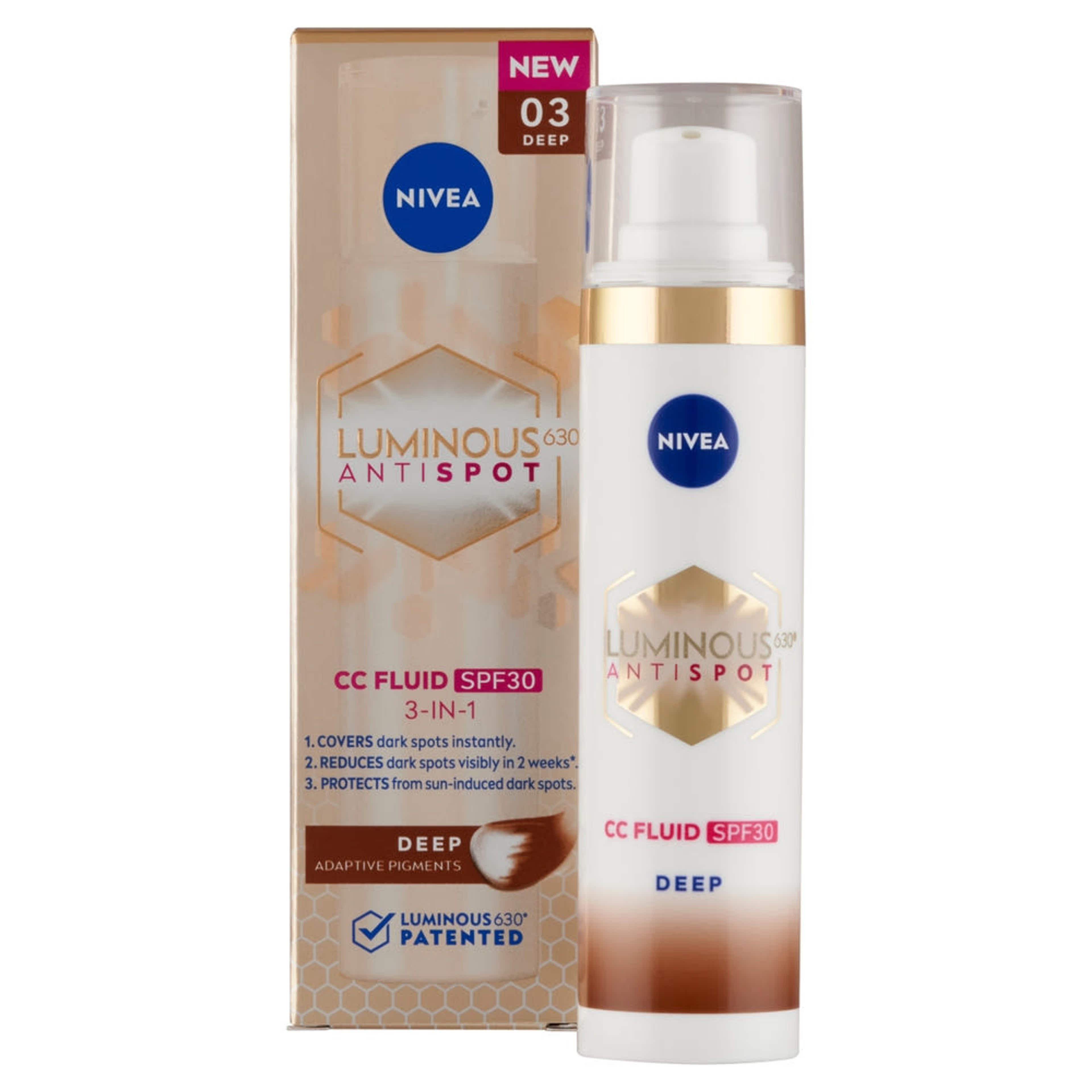Nivea® Cellular Luminous630® pigmentfoltok elleni CC Fluid FF30 sötét színárnyalatban, hármas hatásának köszönhetően segít egységesebbé tenni a bőrtónust: