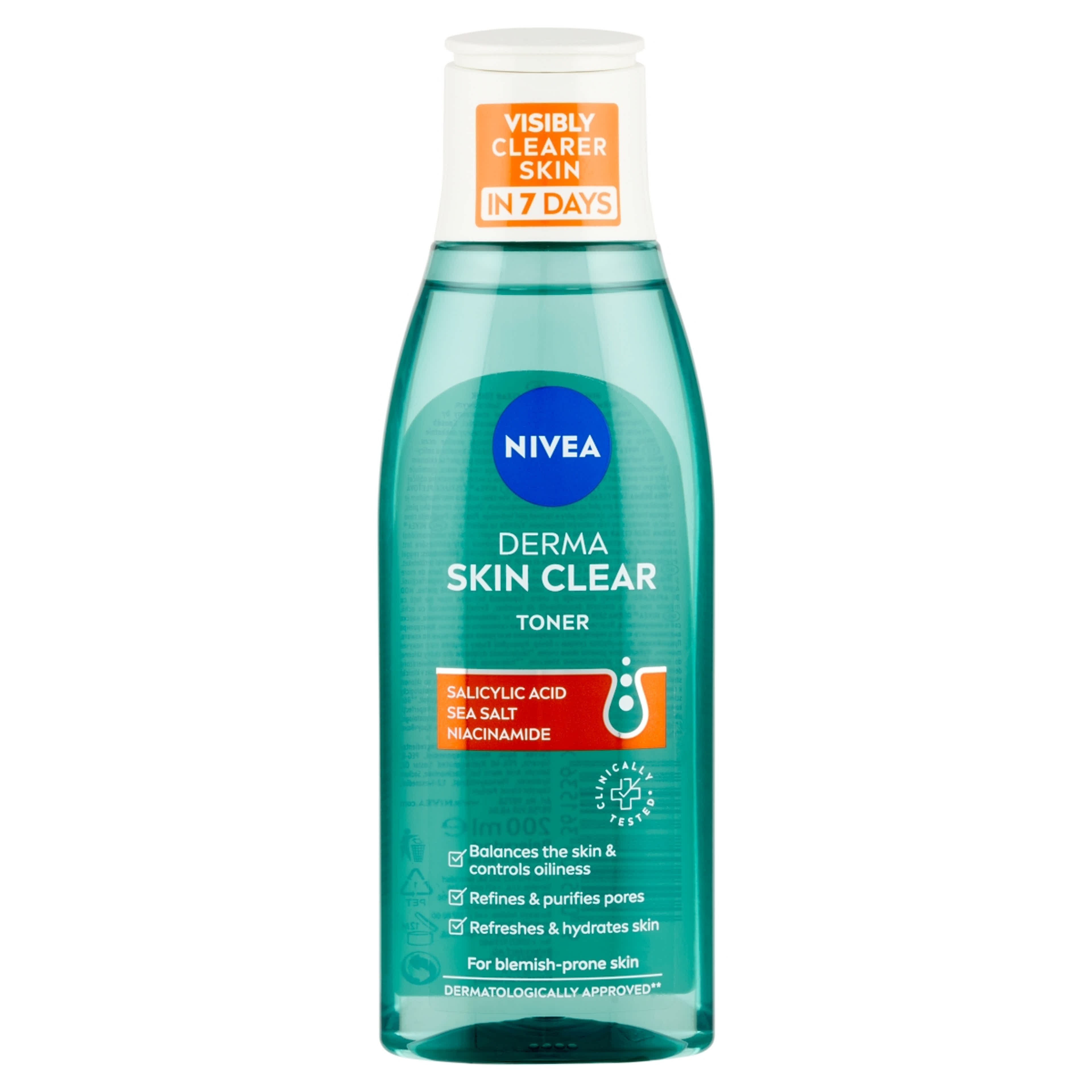NIVEA® Derma skin clear arctisztító tonik szalicilsavval, tengeri sóval és niacinamiddal kifejezetten a pattanásokra hajlamos bőr egyensúlyának helyreállítására lett kifejlesztve. Csökkenti a faggyútermelést és finomítja a pórusokat.