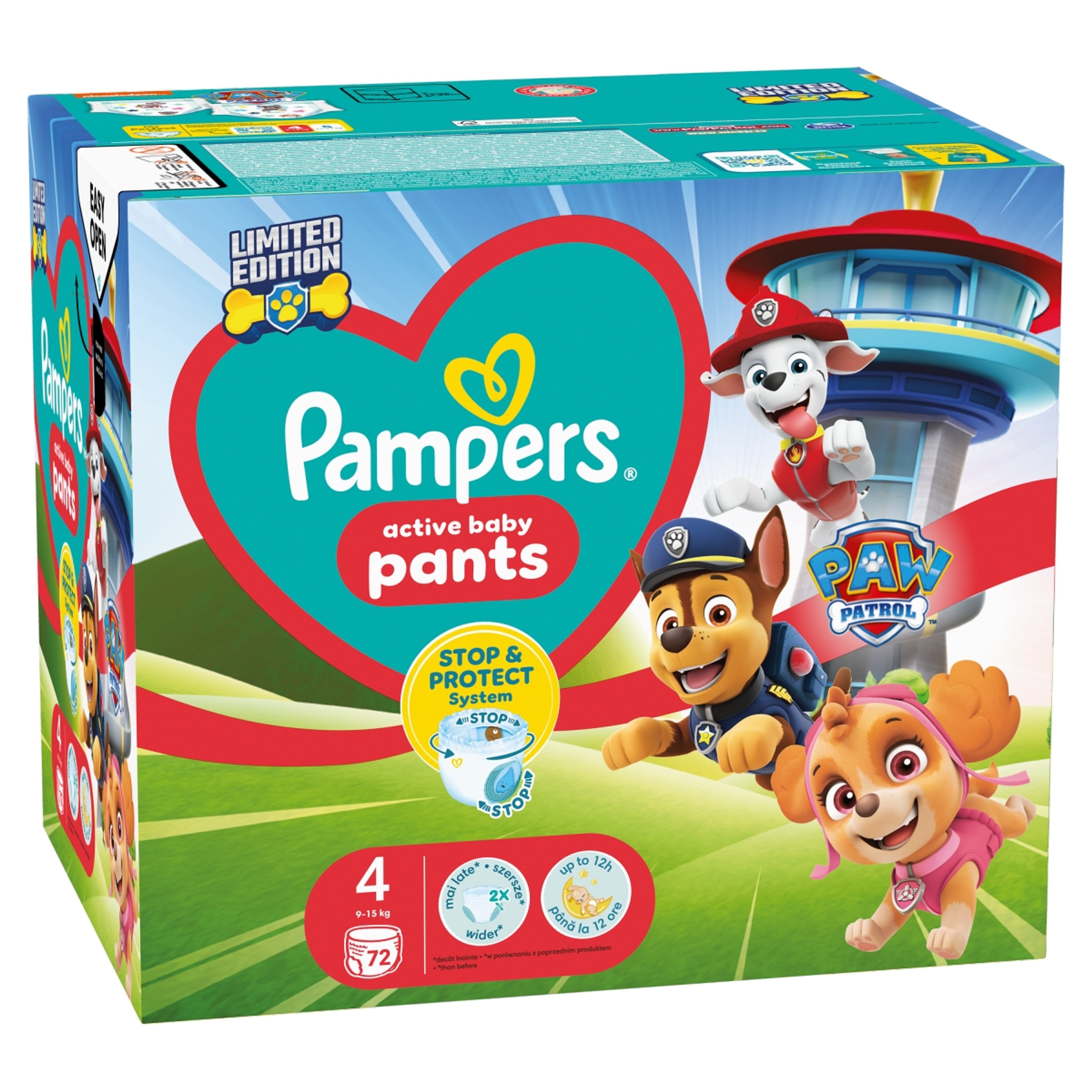 360°-os körkörös illeszkedés, mely megvéd téged és a kisbabádat a szivárgással szemben. A szivárgás elleni Active Baby bugyipelenka most a Mancs őrjárat kedvenc mesefiguráival kapható! A 2x szélesebb* védőgát segít megelőzni a combok körüli szivárgást, a Stop & Protect kakitasi segít megakadályozni a hátoldali szivárgást, míg a 360°-os rugalmas derékgumírozás a kisbaba alakjához igazodva gondoskodik az akár 12 órás szivárgás elleni védelemről, éjjel és nappal. Az összes többi Pampers pelushoz hasonlóan a Pampers Active Baby Mancs őrjárat bugyipelenkát is könnyű cserélni, még akkor is, ha közben kisbabád izeg-mozog. Egyetlen mozdulattal felhúzható, feltéphető oldalainak köszönhetően könnyen levehető, és összetekerve, a ragasztószalaggal rögzítve könnyen kidobható. Hozzád hasonlóan a Pampers számára is a kisbabád biztonsága a legfontosabb: A Pampers Active Baby Mancs őrjárat bugyipelenkákat a Skin Health Alliance bőrgyógyászai tesztelték, és igazolták, hogy azok használata biztonságos a kisbabák bőre számára. Szeretnél többet tudni az összetevőkről? Látogass el a pampers.hu webhelyre. (*A korábbi modellhez képest.)